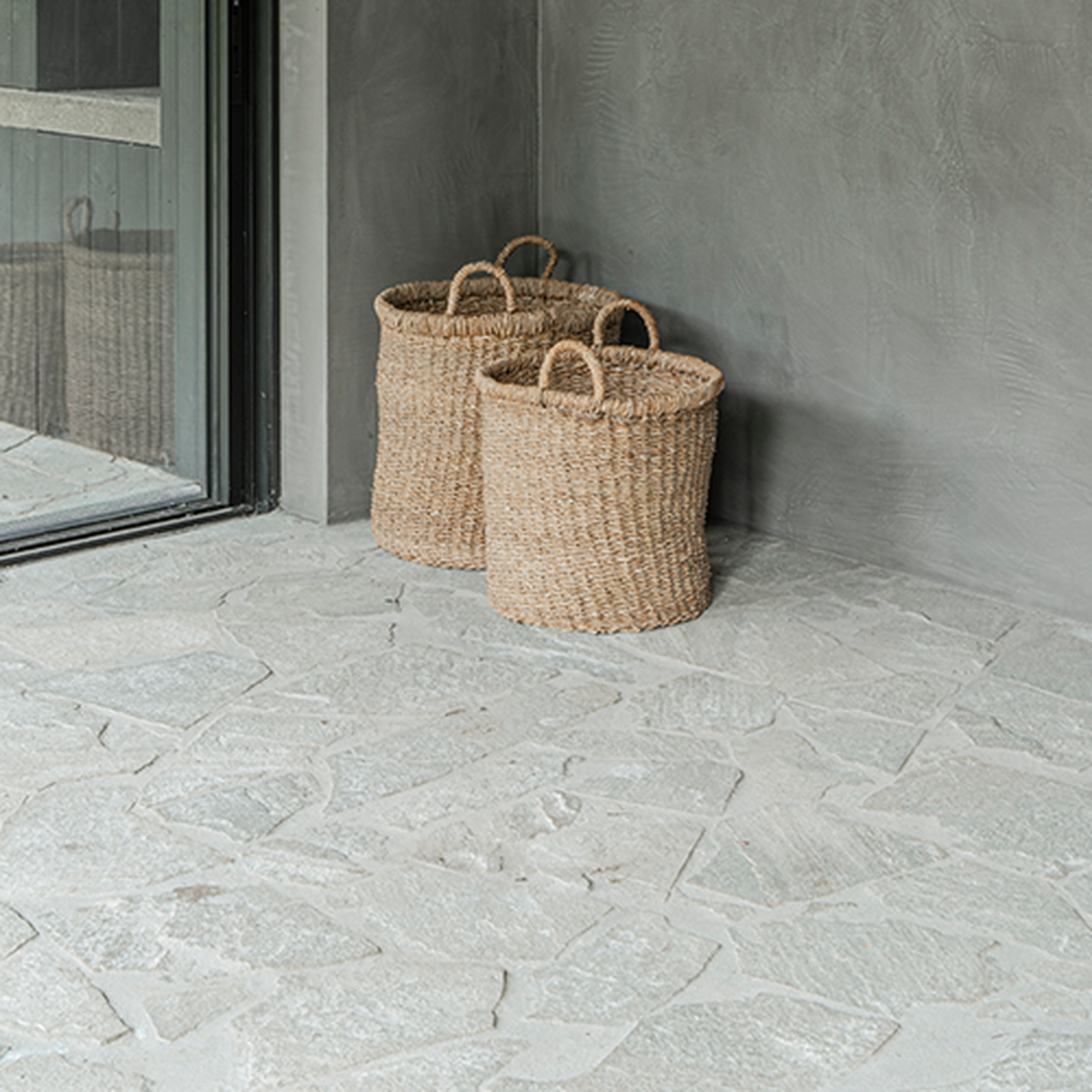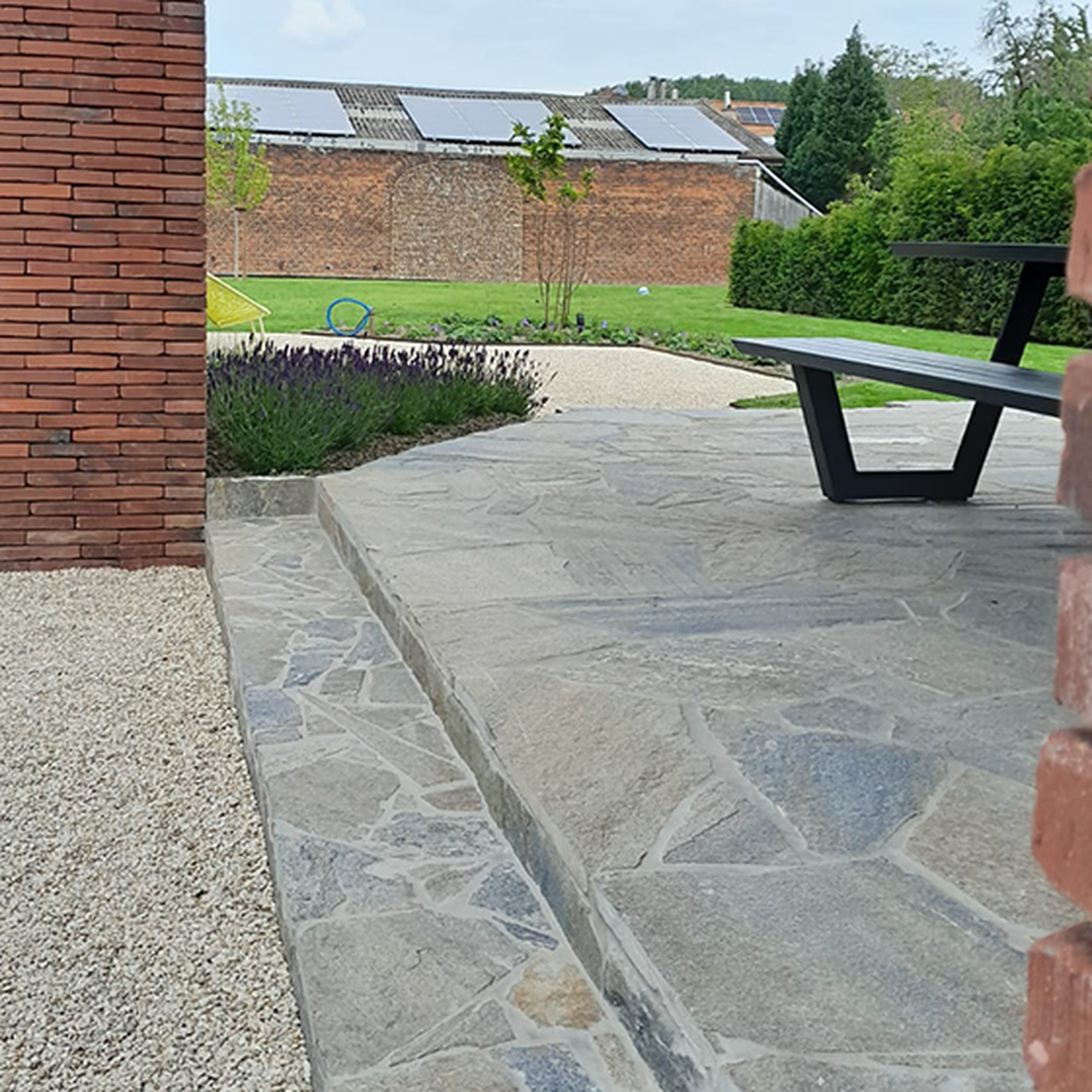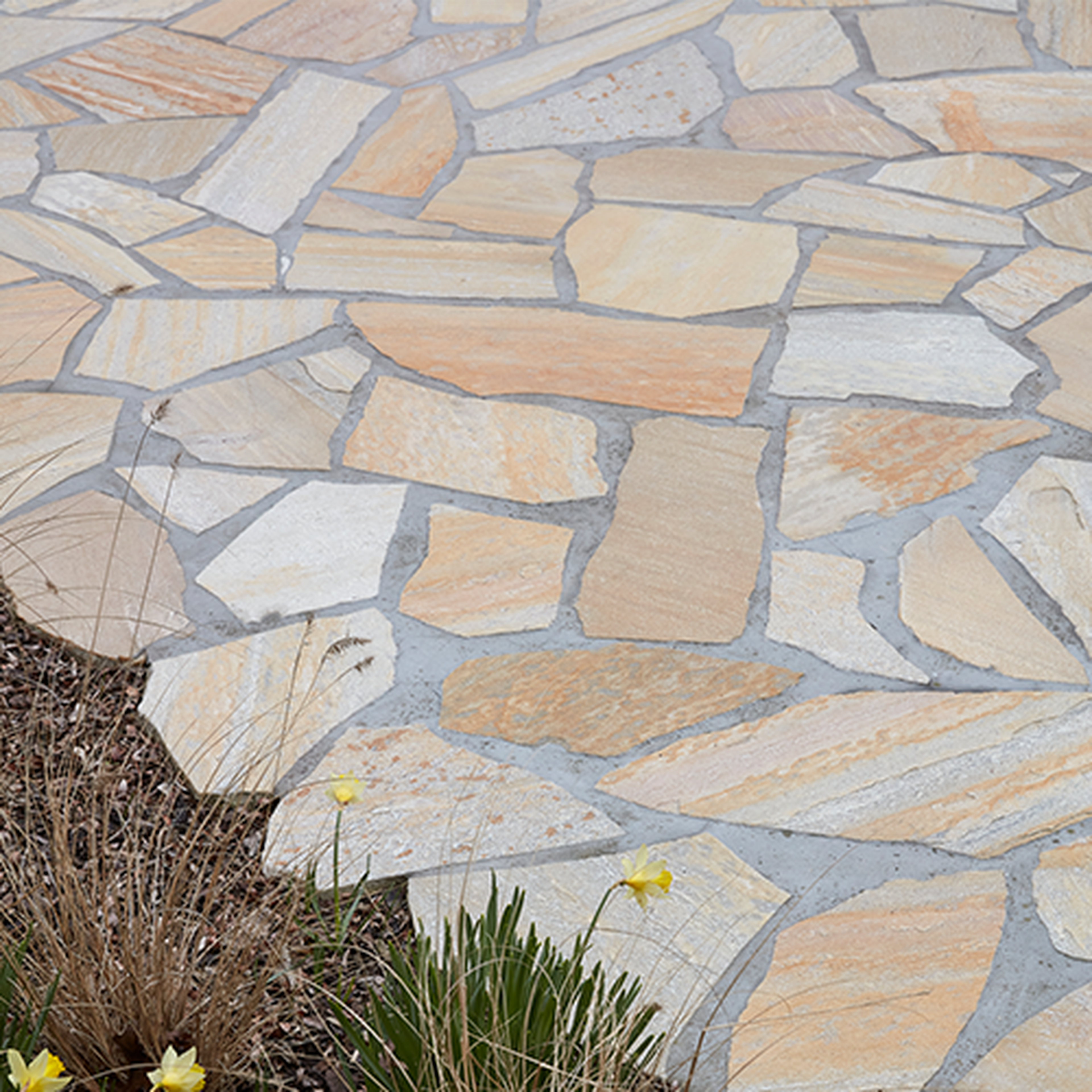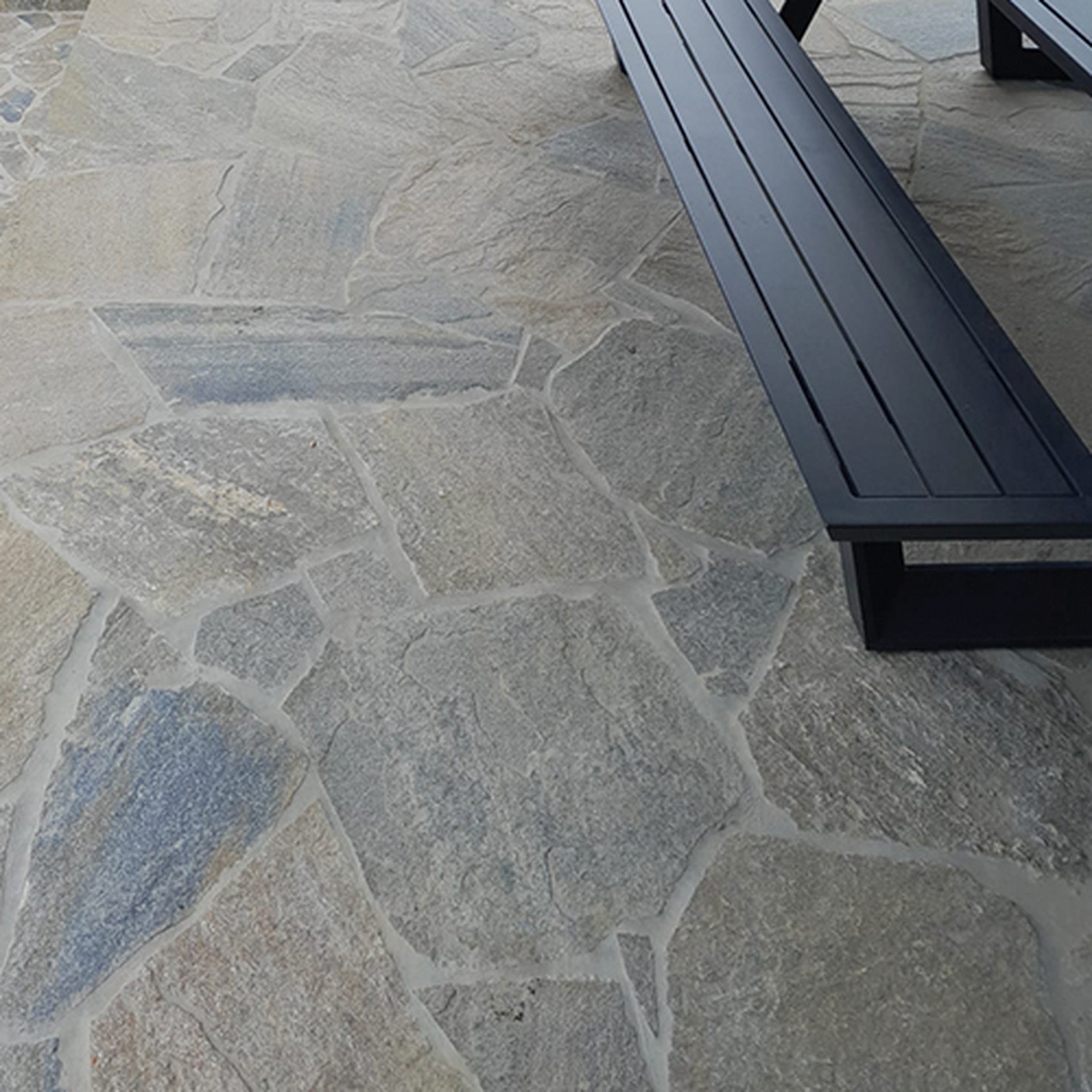 Flagstones sind mit ihrem natürlichen Aussehen und ihrer verspielten Form stark auf dem Vormarsch bei Anwendungen im Freien. Diese Verlegung von Scherben (gebrochenem Naturstein) wird aufgrund ihrer Haltbarkeit und Ästhetik häufig für Terrassen, Gartenwege und Einfahrten verwendet. Sie verleihen Außenbereichen einen rustikalen Charme und sind in einer Vielzahl von Farben und Texturen erhältlich.