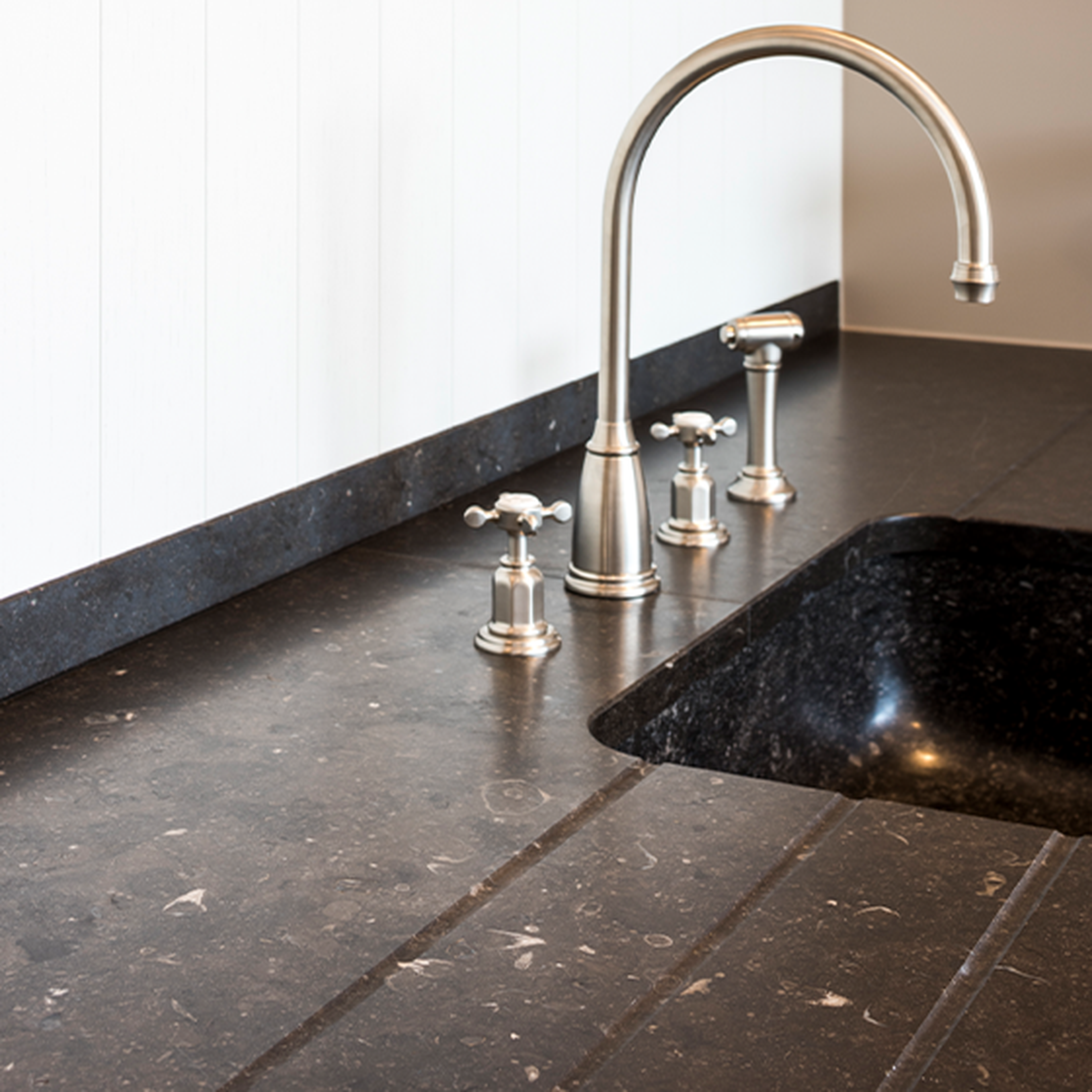 Dank ihrer besonders dichten Struktur und hohen Härte sind diese harten Kalksteine hervorragend für Küchenarbeitsplatten geeignet. Sie teilen viele Eigenschaften mit Marmor, sowohl hinsichtlich ihrer zeitlosen Ausstrahlung und natürlichen Eleganz als auch in Bezug auf die Pflege. Blaustein ist von Natur aus hitzebeständig, aber aufgrund seiner Zusammensetzung weniger beständig gegen Säuren, Kratzer und Flecken. Daher ist eine korrekte und regelmäßige Pflege einer Küchenarbeitsplatte aus Blaustein unerlässlich. Diese Pflege ist unkompliziert, schützt die Oberfläche und sorgt dafür, dass der Stein mit den Jahren immer schöner wird und zudem weniger fleckenanfällig ist.
