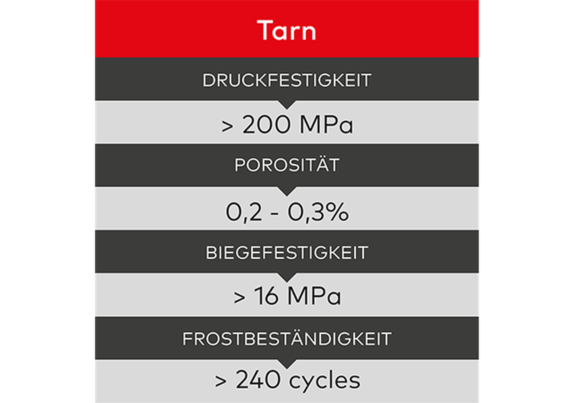 ausgezeichneter Widerstandsfähigkeit gegen Frost-Tau-Wechsel (> 240 Zyklen gemäß EN 12371)