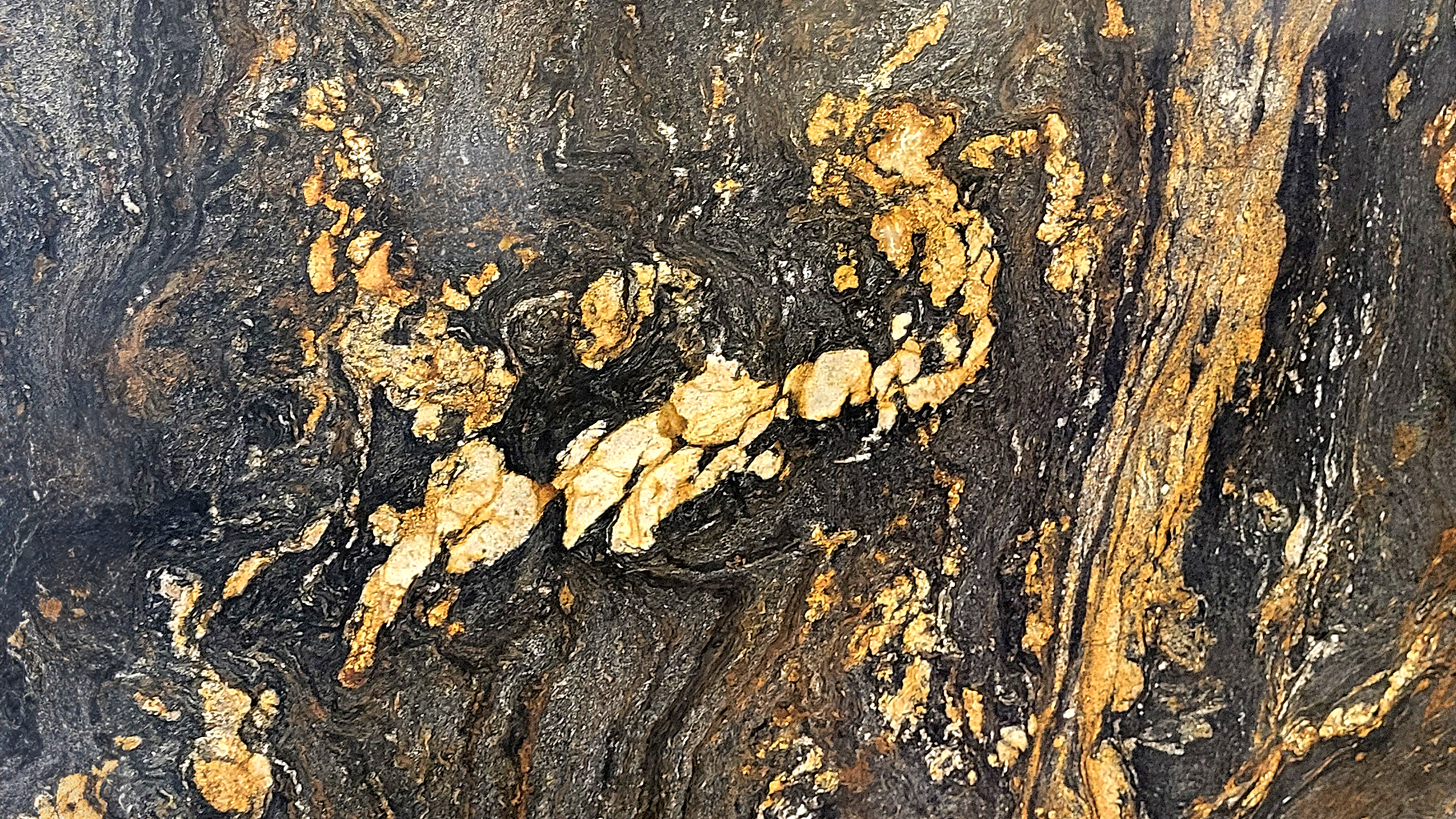 Beschreibung:Schwarzer Granit mit weiß-/goldfarbigen Adern / Mineralkonzentrationen und einer mäßig grobkörnigen, heterogenen Struktur. Das Aussehen ist band- bis fächerförmig.