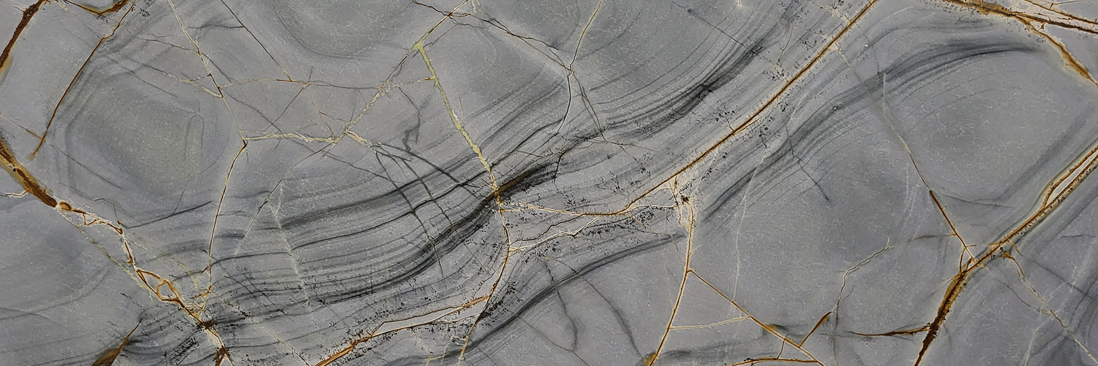 Beschreibung:Feinkörniger blaugrauer Quarzit mit schwarzen und goldfarbenen Adern/Mineralkonzentrationen.