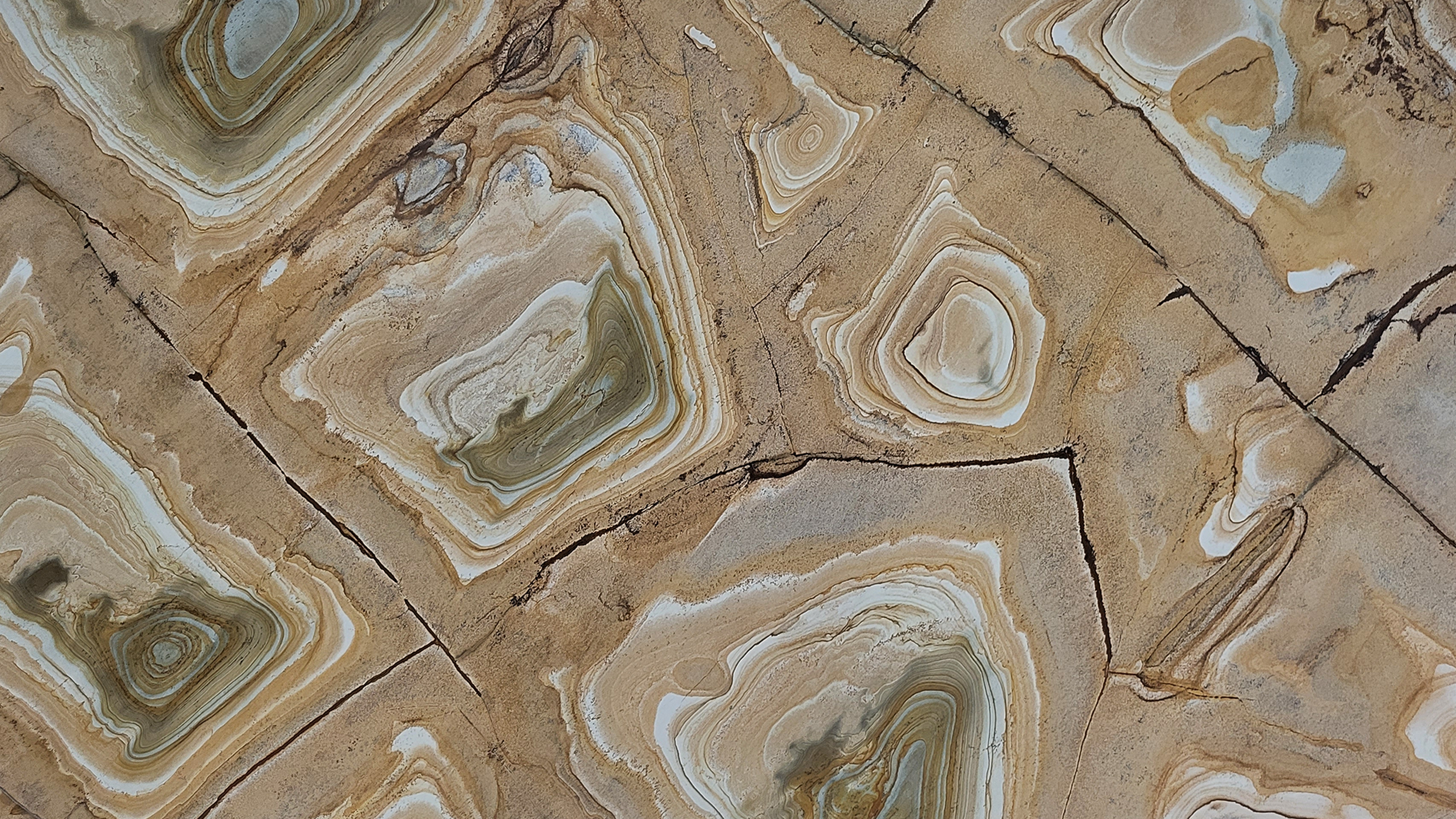 Beschreibung:Feinkörniger, heller Quarzit mit gelb-orange-braunen Farbtönen und dunkleren Adern, die über die Oberfläche verstreut sind.