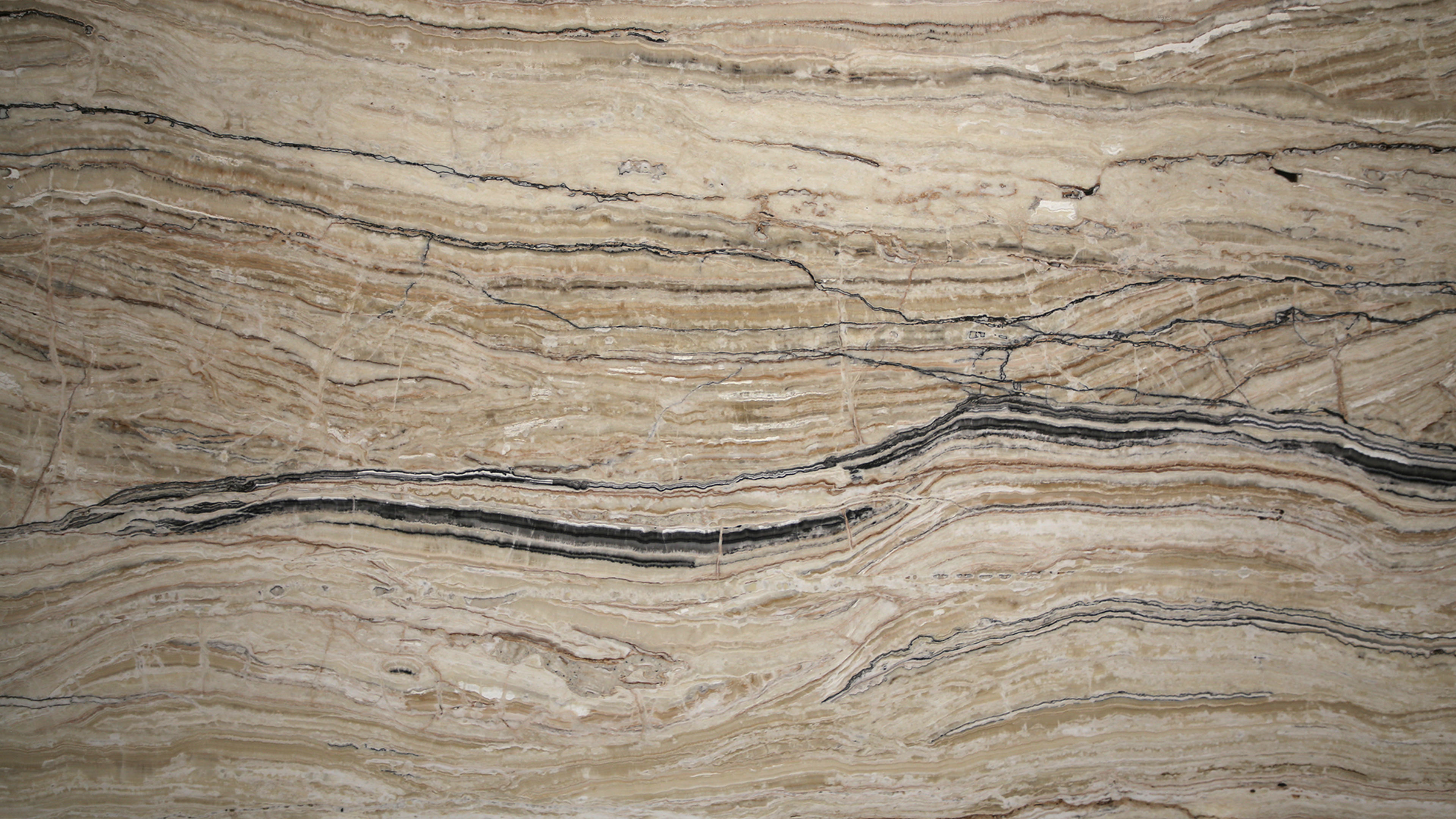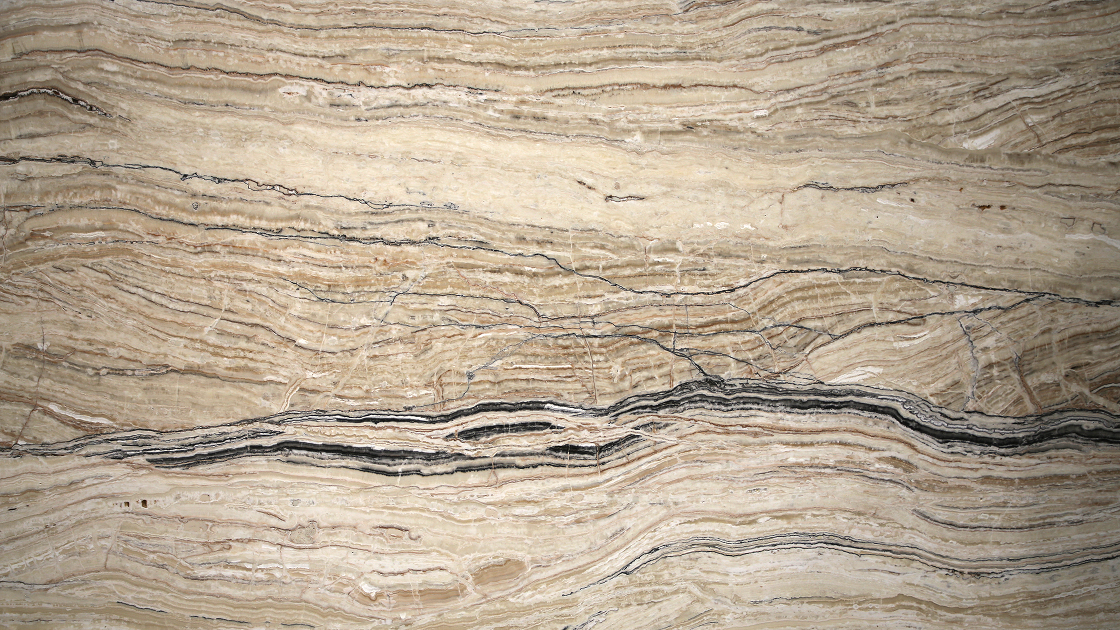 Beschreibung:Beige-rosa und weißer Marmor mit Travertin-Struktur (ausgeprägte Linienzeichnung durch dunklere Linienstruktur). Die Zeichnung ist sehr heterogen und vor allem bandförmig (horizontal und parallel; senkrecht zur Schichtung gesägt).