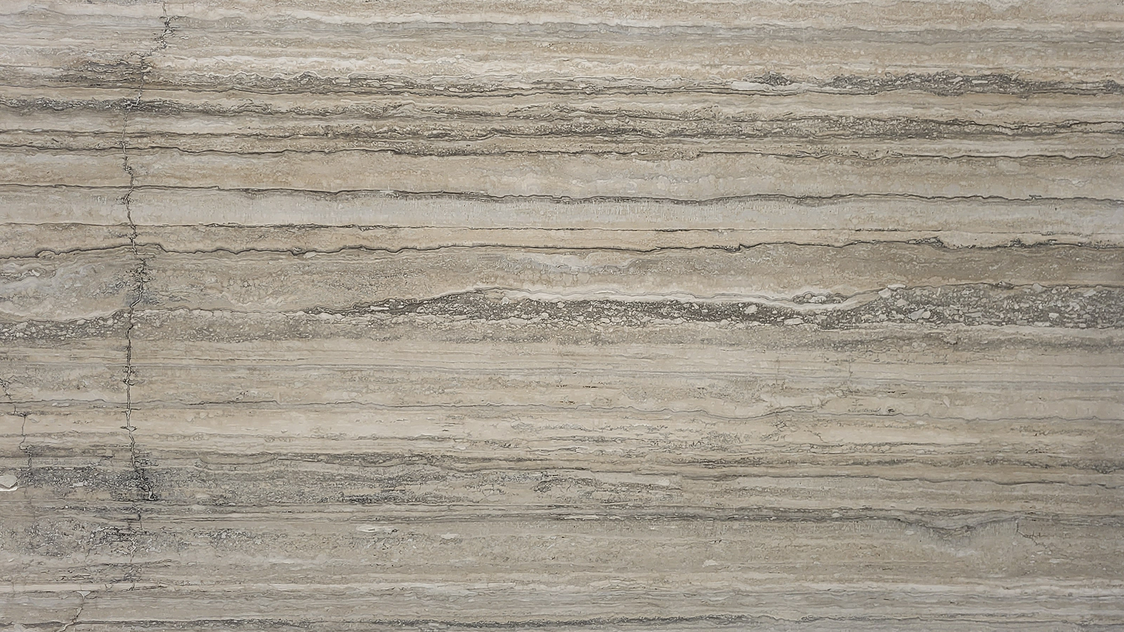 Beschreibung:Beiger bis beige-grauer kompakter Kalkstein (Travertin) mit ausgeprägter Linienzeichnung durch dunklere/hellere Linienstruktur. Die Zeichnung ist sehr heterogen und vor allem bandförmig (horizontal und parallel; senkrecht zur Schichtung gesägt). Die Oberfläche enthält kleine Öffnungen, die in der Regel gefüllt sind.