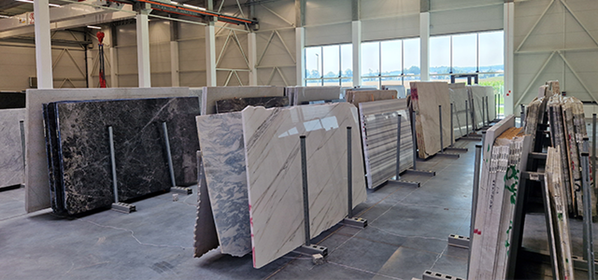 The storage areas are serviced by a 35-tonne gantry crane, two 16-ton bridge cranes, a 15-ton mobile crane, which enables the handling of full containers, granite blocks, and all kinds of slabs and tiles.