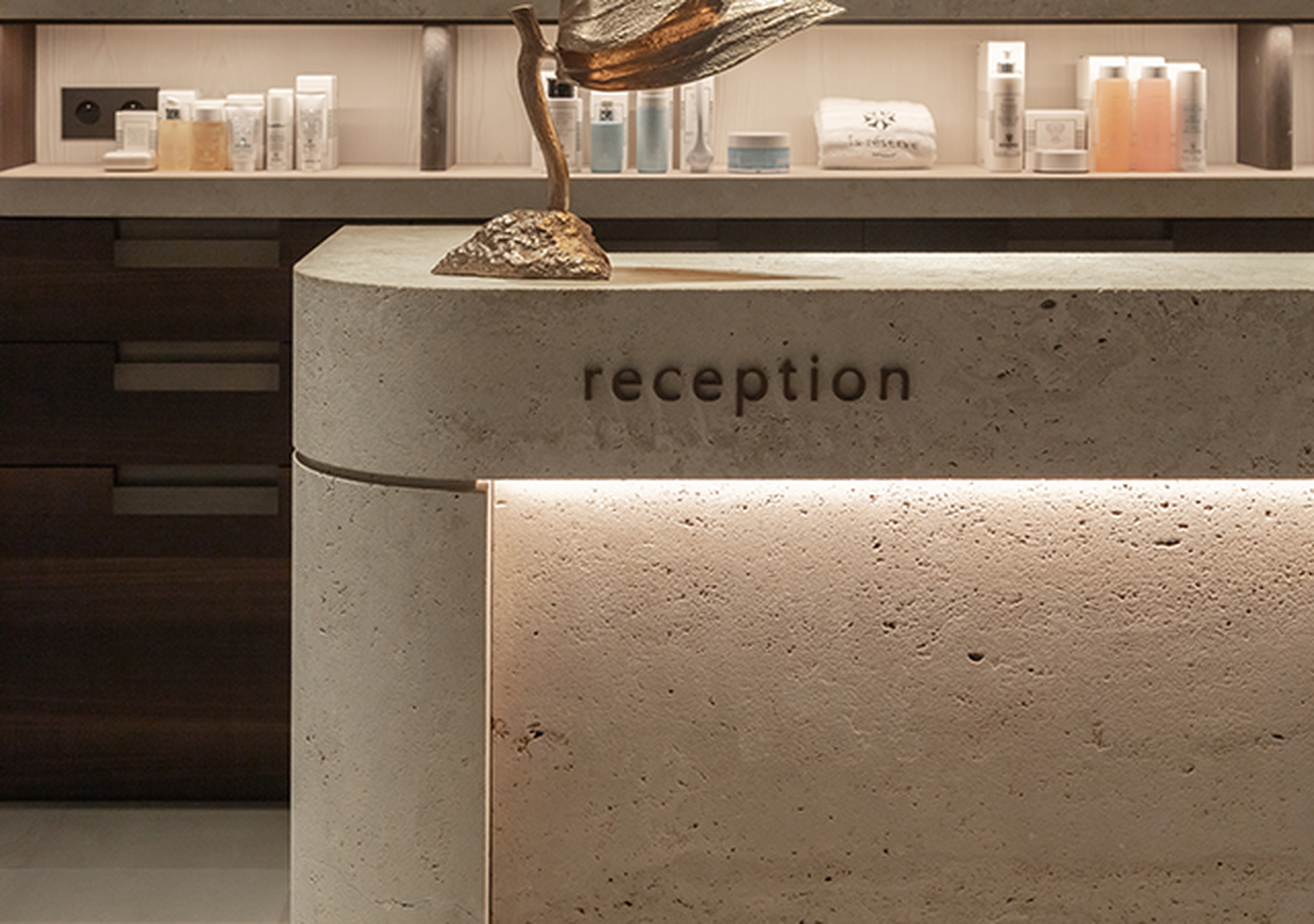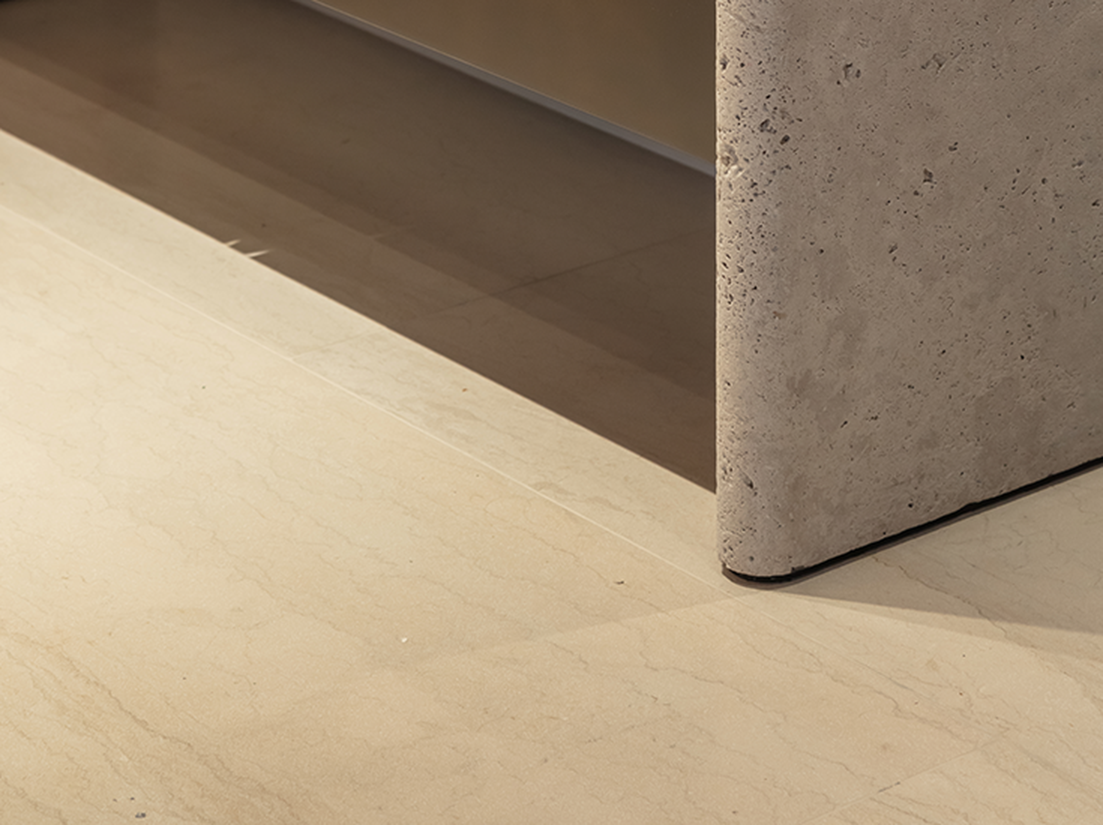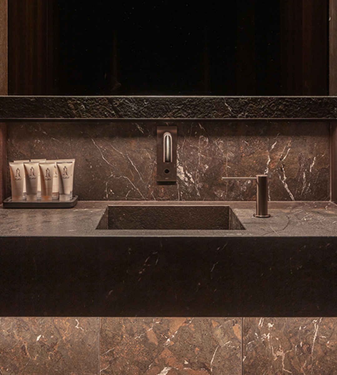 In addition to Tesoro Veneziano, Italian travertine Pietra Bicci also plays an important role in the project. This material was notably used for the wellness area counter. The sensato finish, achieved through light sandblasting and brushing, gives the stone a subtle yet tangible luxury that perfectly matches the exclusive character of La Réserve. To achieve this finish, intensive tests were conducted in Italy until the desired texture and appearance were obtained.