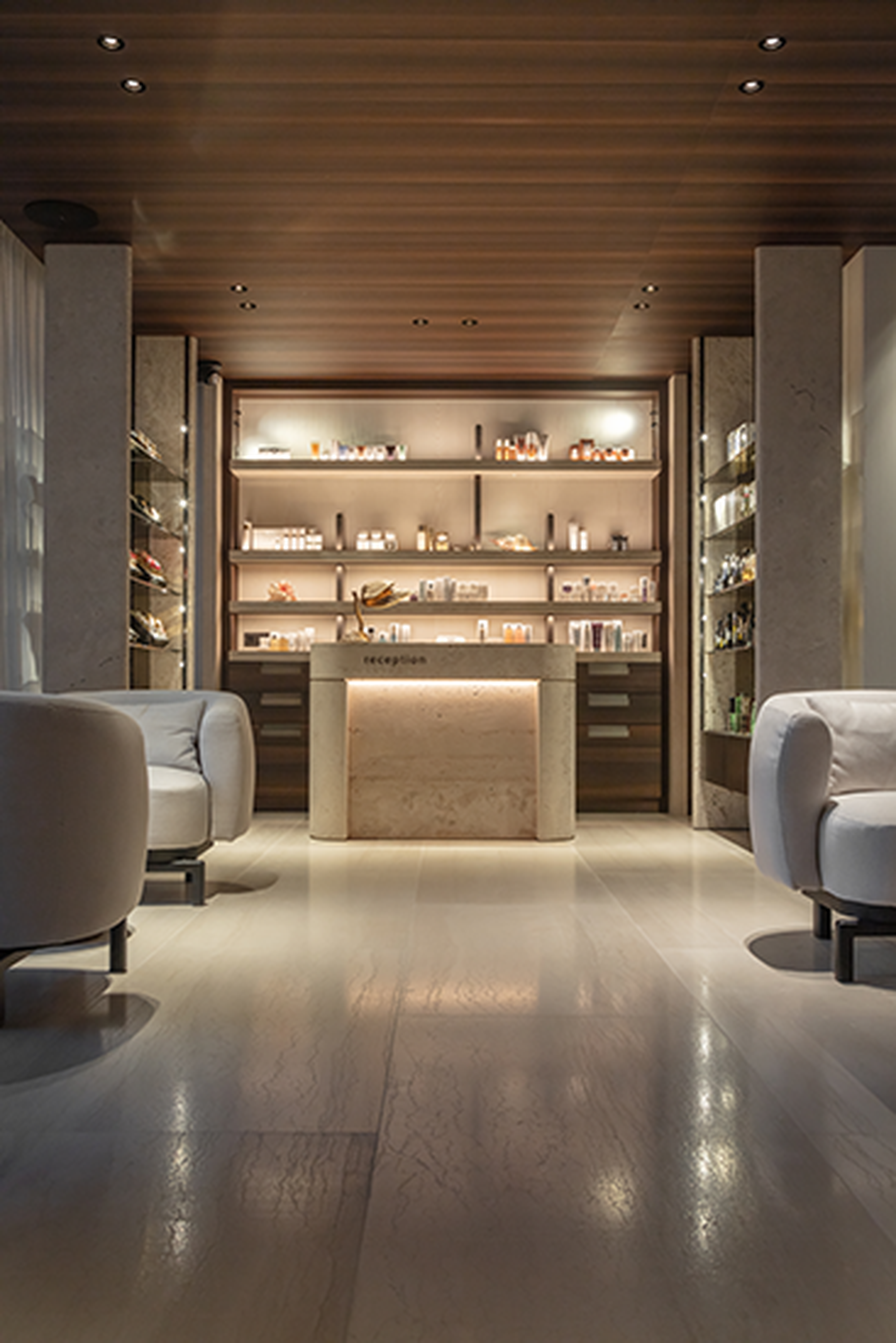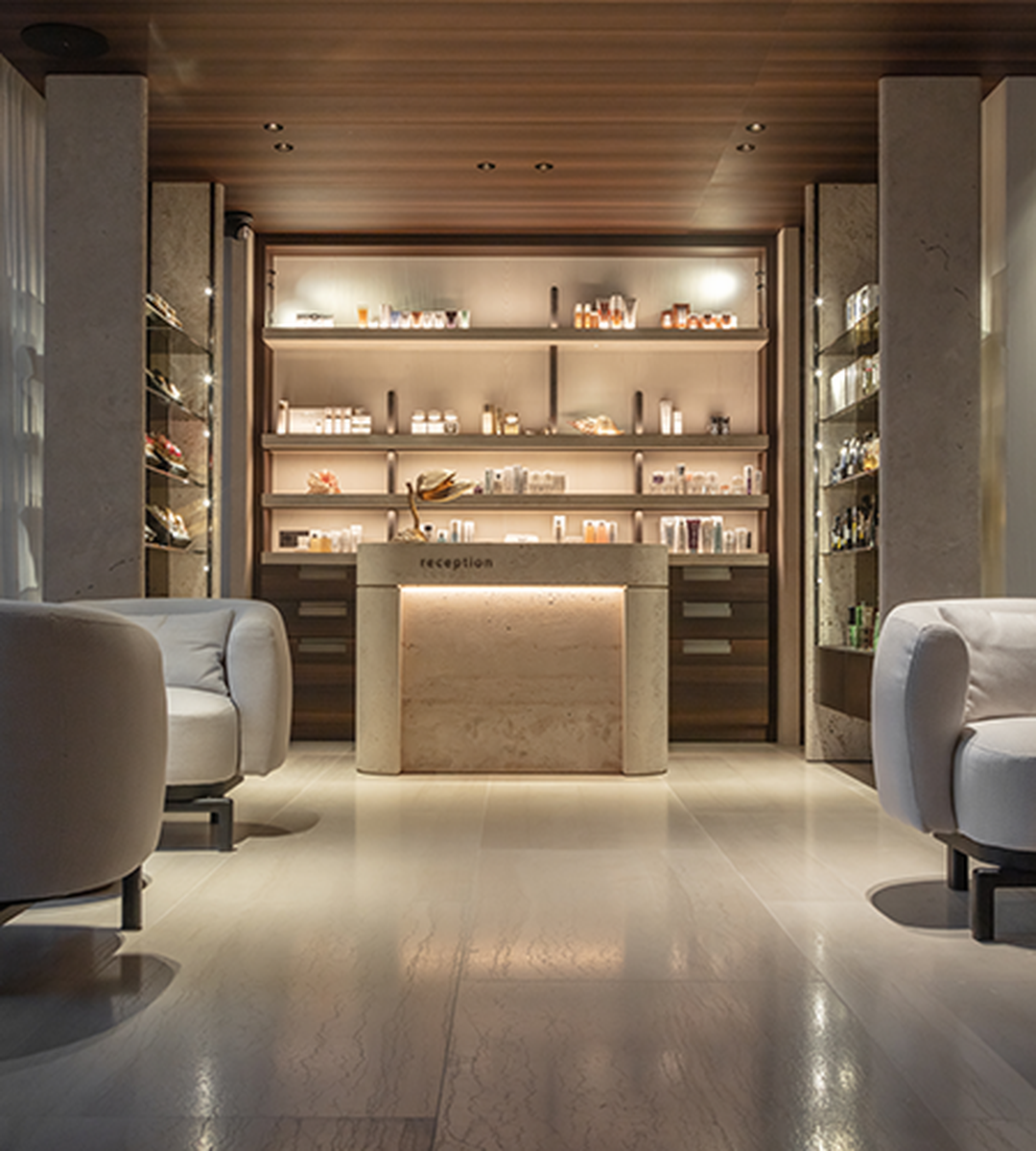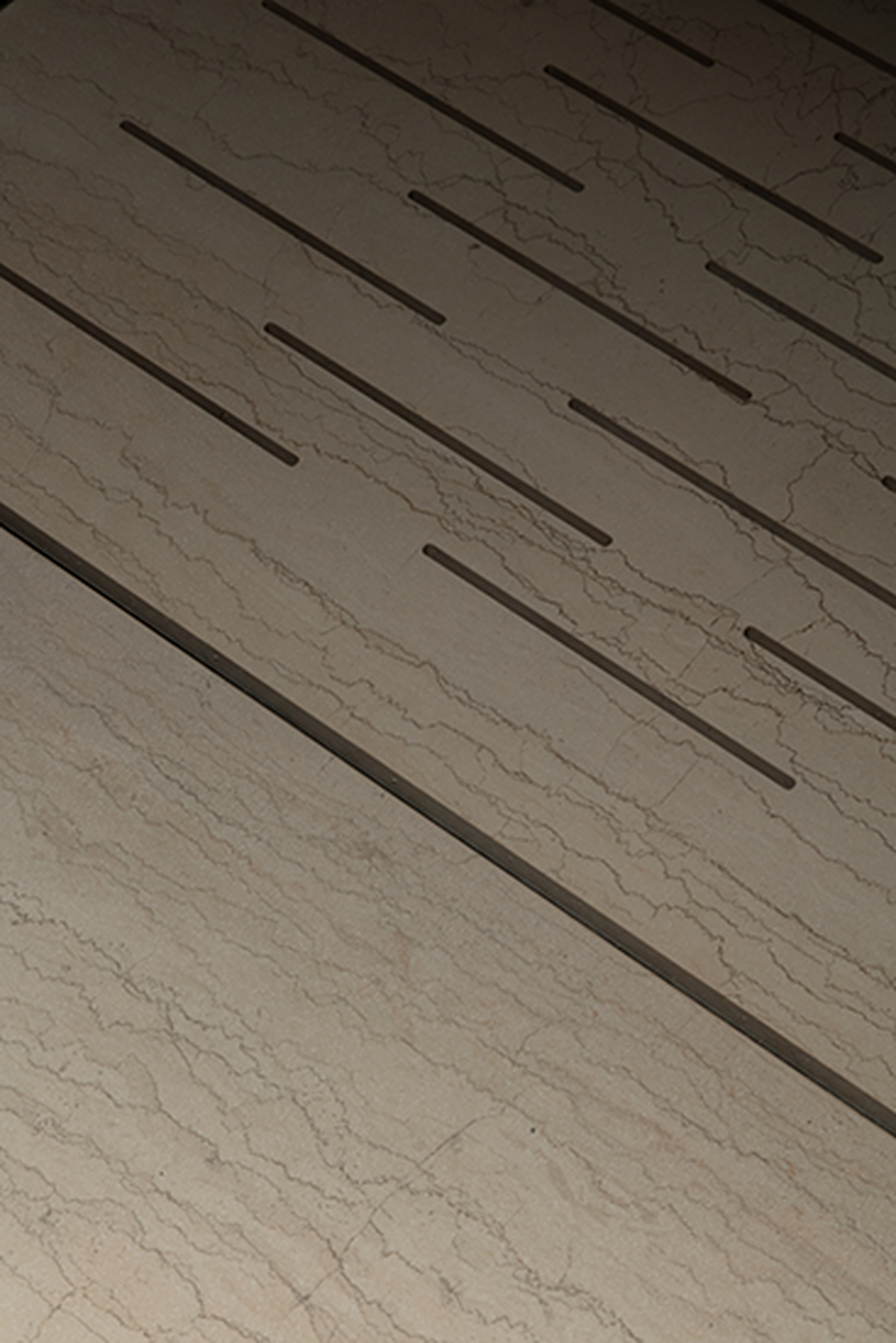 In addition to Tesoro Veneziano, Italian travertine Pietra Bicci also plays an important role in the project. This material was notably used for the wellness area counter. The sensato finish, achieved through light sandblasting and brushing, gives the stone a subtle yet tangible luxury that perfectly matches the exclusive character of La Réserve. To achieve this finish, intensive tests were conducted in Italy until the desired texture and appearance were obtained.