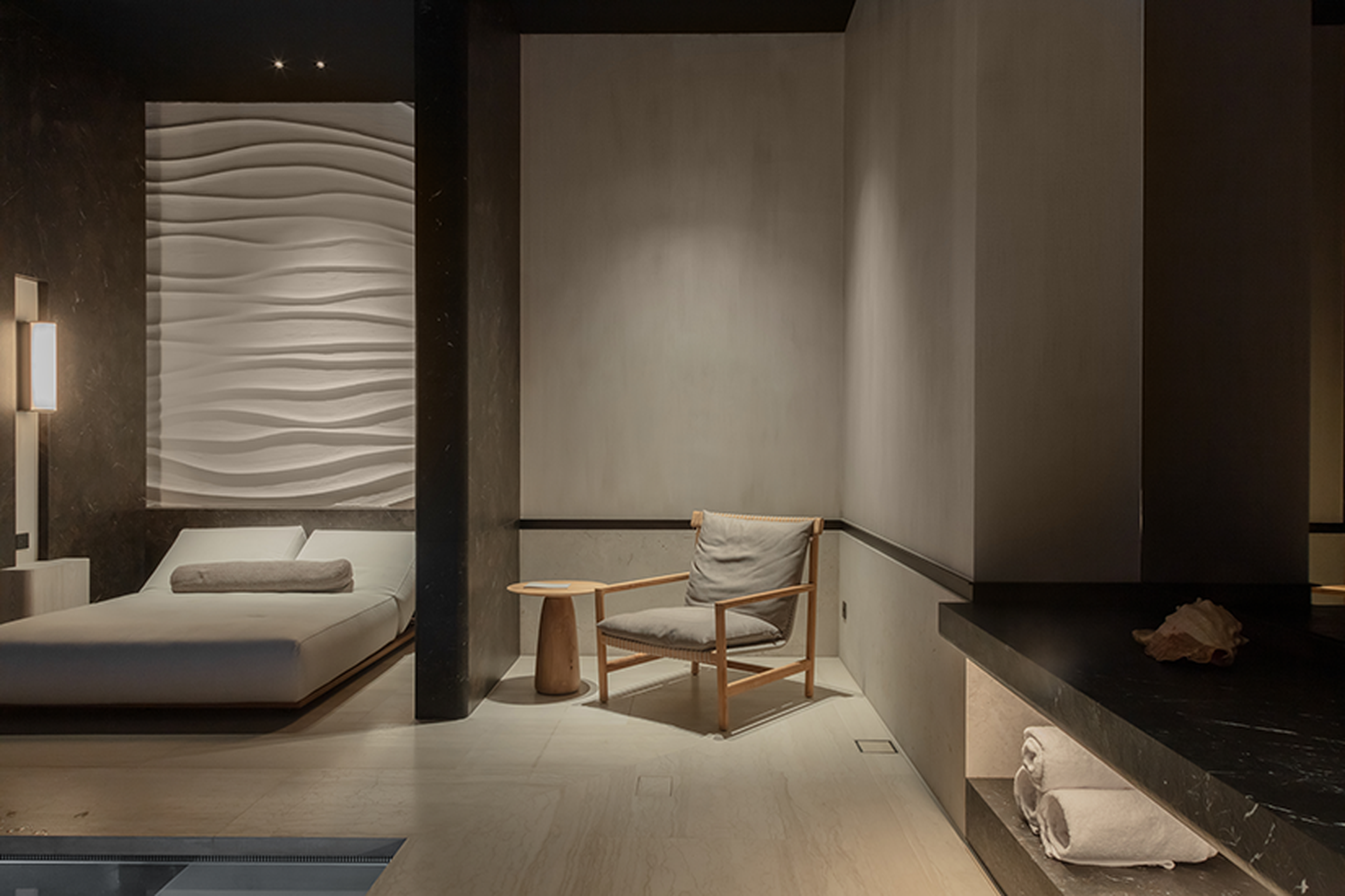 Breccia Imperiale, another significant natural stone in the project, adorns the walls of the wellness area. With its refined anzano finish, achieved through a flamed and brushed technique, this material creates a warm and welcoming atmosphere. It is complemented by subtly undulating structures placed within the walls, inspired by the sand ripples left by the low tide—a subtle nod to the Knokke coast, also featured in the La Rigue restaurant.