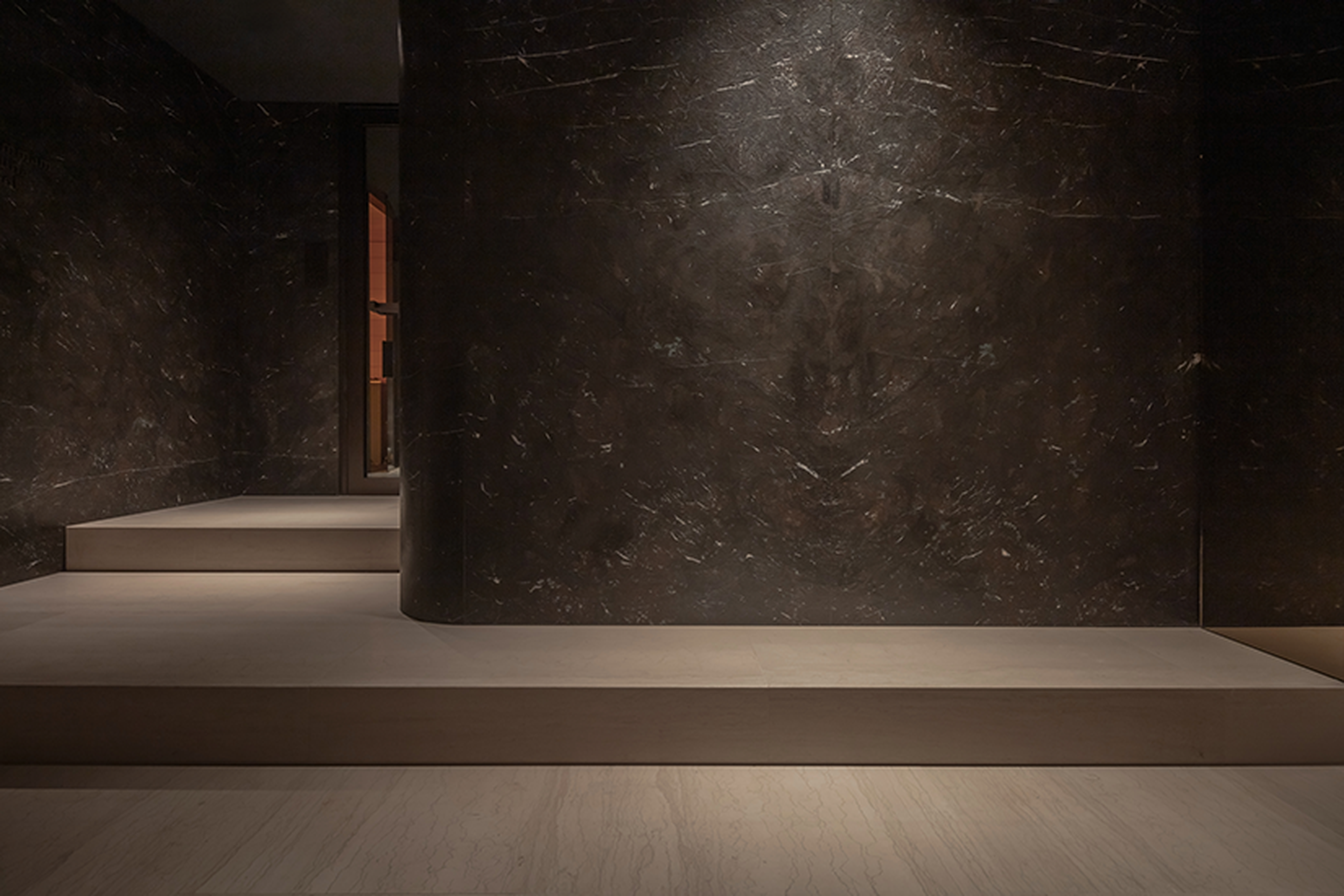 The appearance of the stone was enhanced by a unique surface finish, which required intensive research in collaboration with Brachot to find one that would fully reflect architect Glenn Sestig’s vision. This finish accentuates the horizontal linear structure of Tesoro Veneziano, making the natural stone even more exceptional and contributing to the serene and luxurious ambiance of the wellness space.