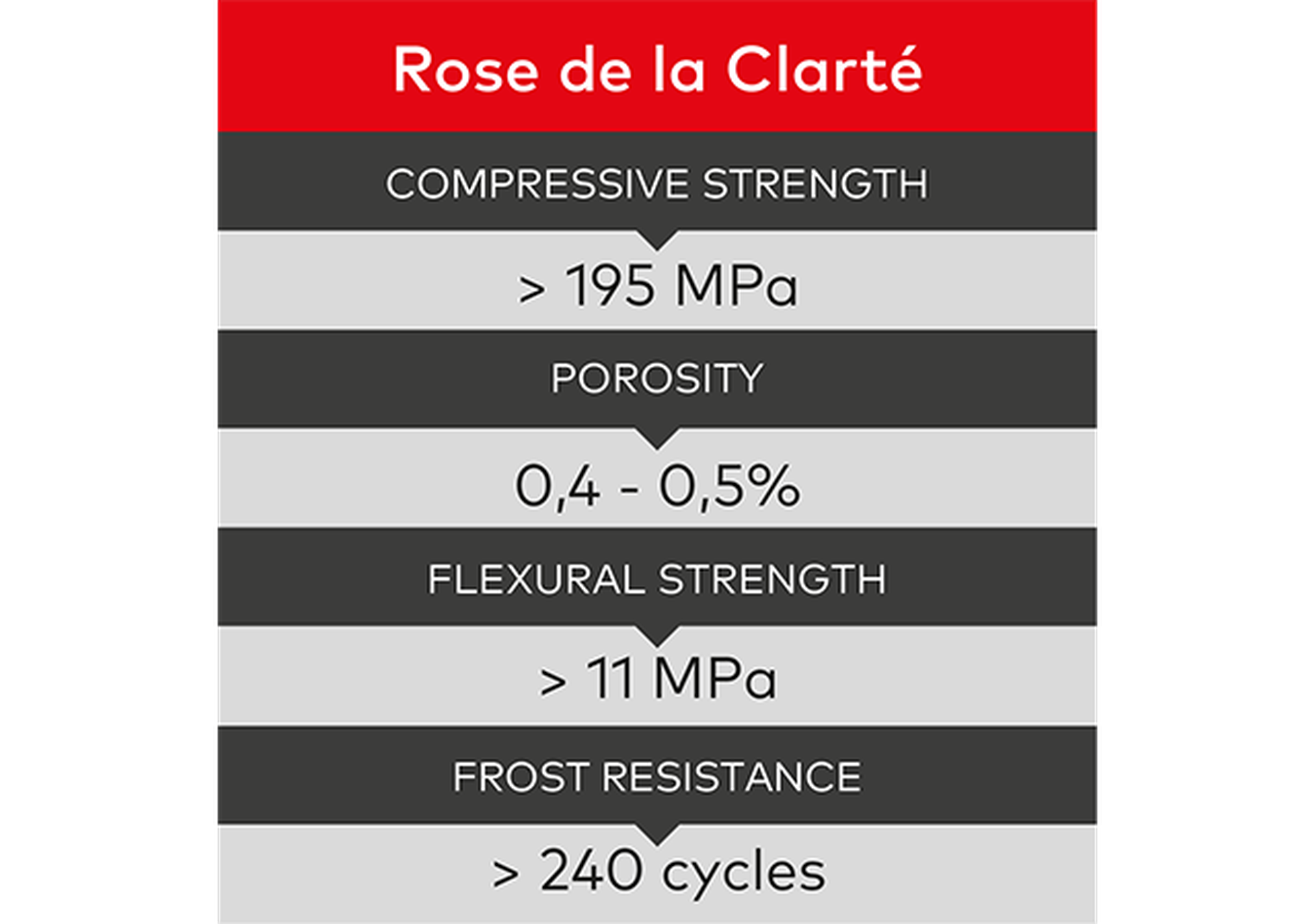 Rose de la Clarté has a frost resistance of more than 240 cycles – almost double the French requirements – ensuring outstanding long-term durability. With a compressive strength of over 195 MPa, it performs nearly twice as strong as the standards for class 6 paving stones (EN 1342), offering unmatched solidity and reliability in both public spaces and heavy-use environments.