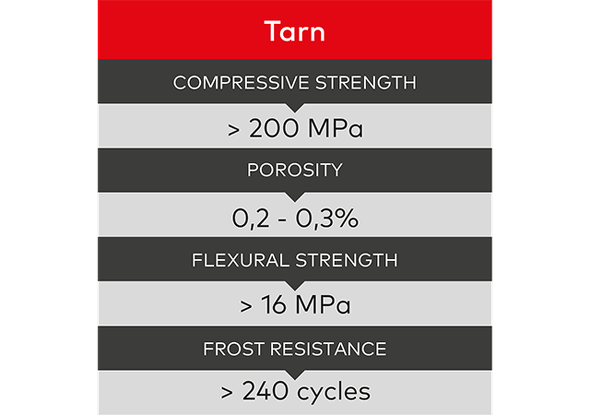 On account of its exceptional hardness, Tarn is also in great demand in areas of high traffic density, for instance, in urban environments.