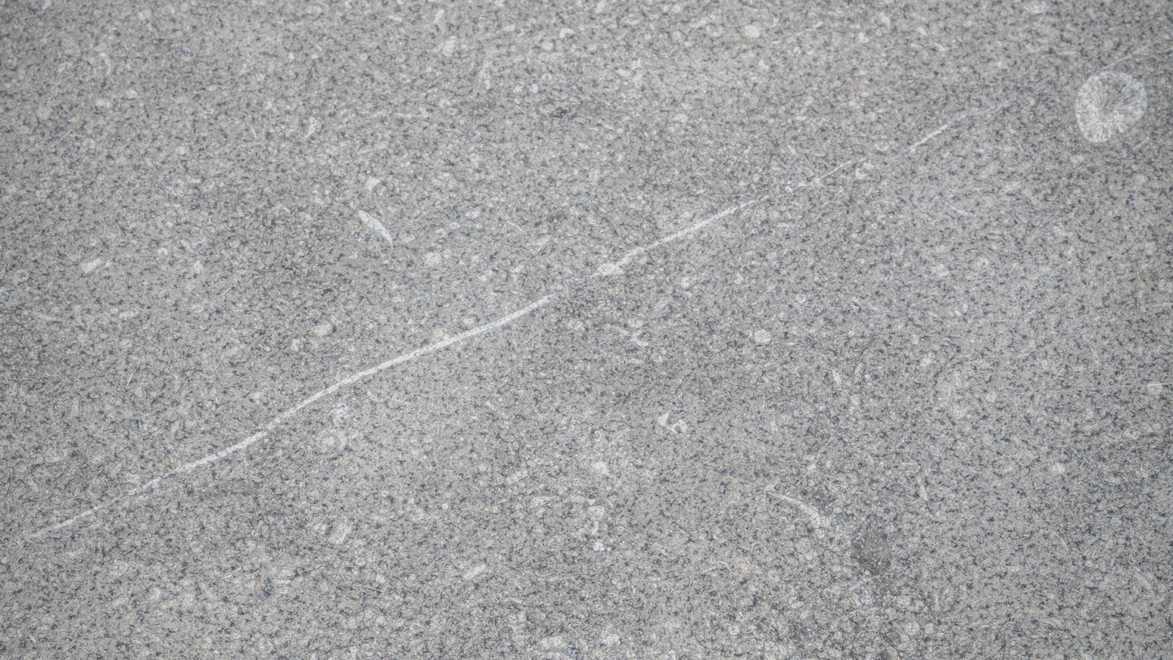 Description:Grey blue compact crinoidal limestone with white fossils (corals and shells), white veins and fine irregular black veins (stylolites) spread over the surface.