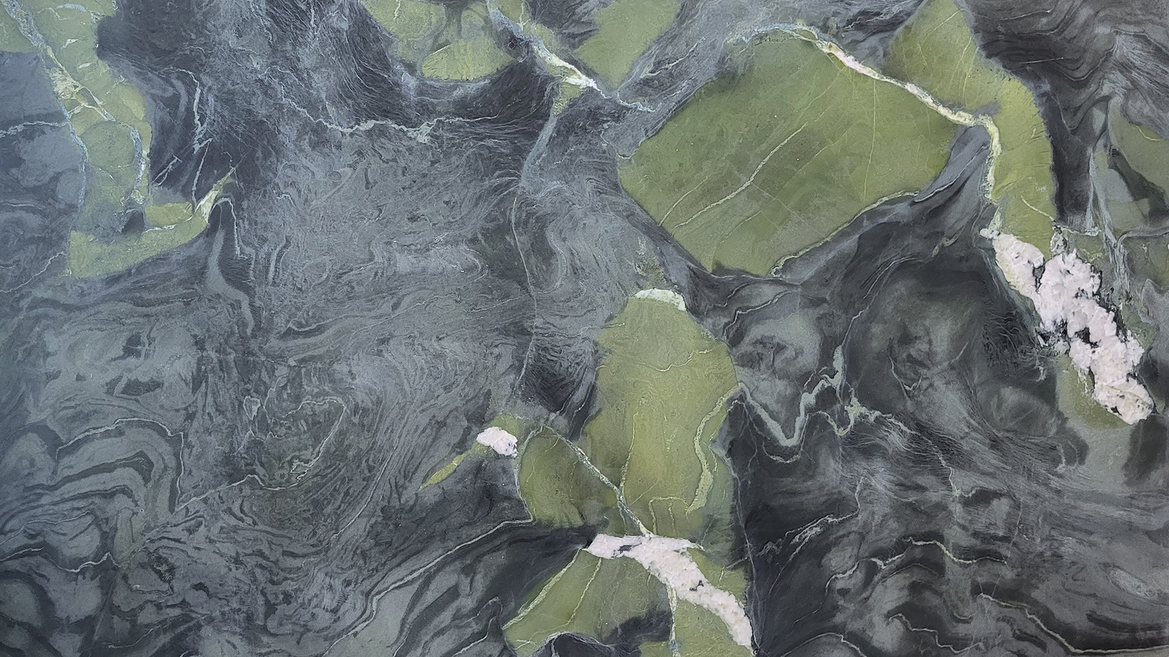 Description:Dark green fine-grained quartzite with paler green en white and/or black veins/mineralconcentrations.