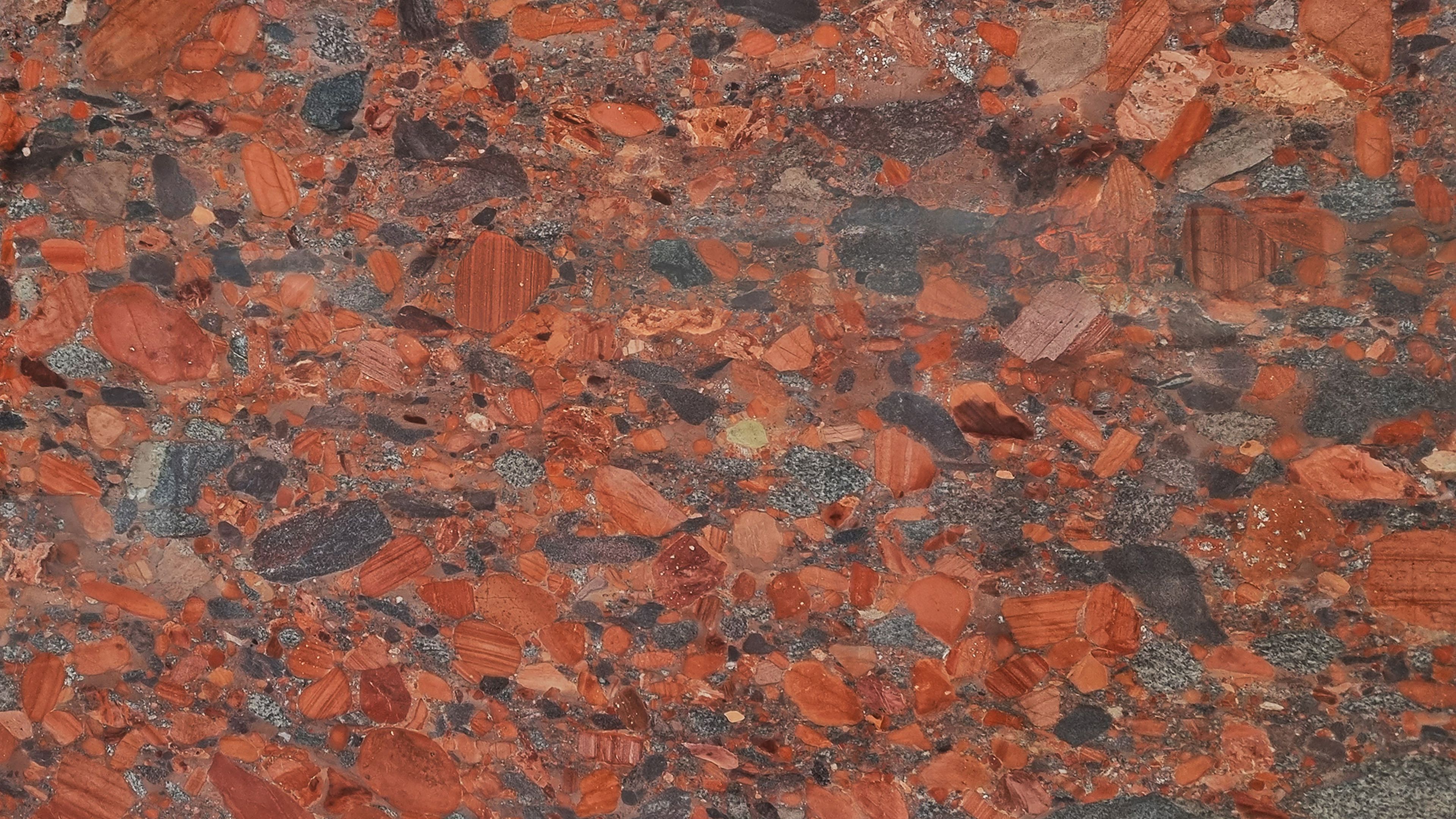 Description:This red conglomerate shows large rounded fragments in different colours and sizes, in a predominantly red ground mass. The rounded rock fragments can be up to 15 cm in size. Very heterogeneous composition.