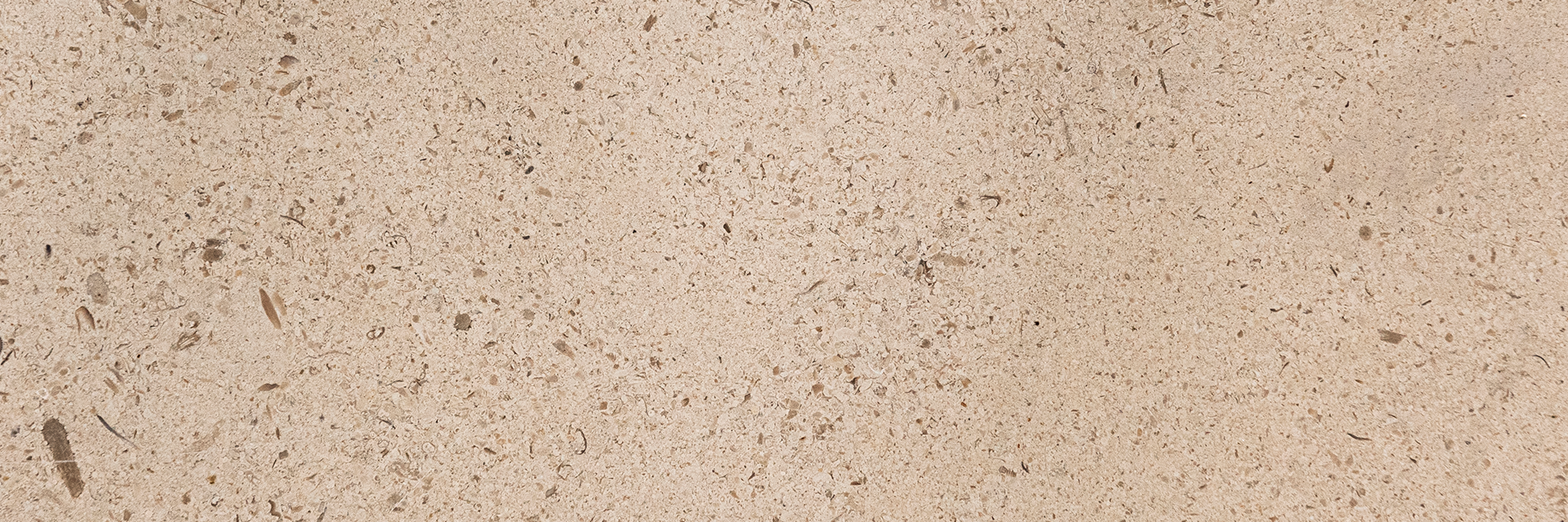 Description:Sedimentary limestone with a light beige background with concentrations of more or less scattered, black-brown particles and sometimes a slight vein.