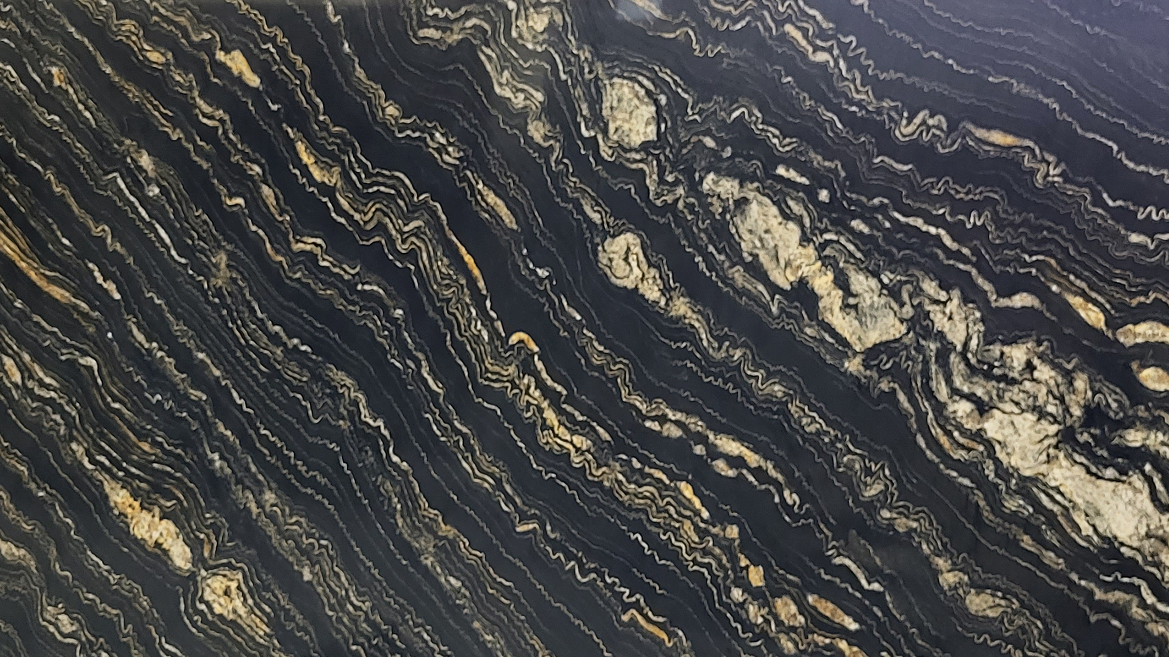 Description:Fine-grained black granite with irregular white to gold-colored veins.