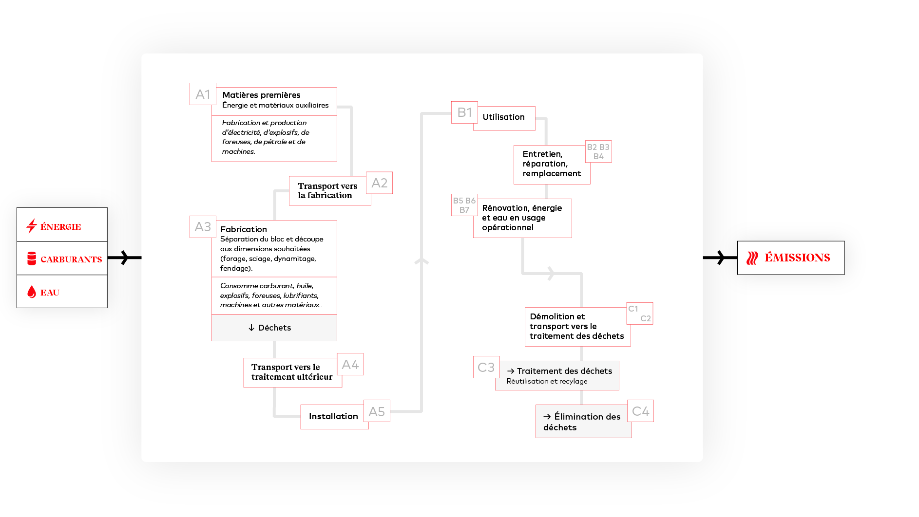 Un critère important dans cette comparaison est le potentiel de réchauffement global total (PRG total), mesuré en kilo équivalent CO₂ (éq. CO₂). Les déclarations environnementales de produits (EPD) du Brachot Family Member Larvik Granite montrent que le PRG total pour la production de blocs varie entre 30 kg éq. CO₂ et 70 kg éq. CO₂. Ces chiffres – tous calculés par tonne de pierre naturelle – s'appliquent aux phases A1-A3 (sortie carrière), qui incluent l'extraction, mais qui excluent le transport (A4) pour la transformation ultérieure.