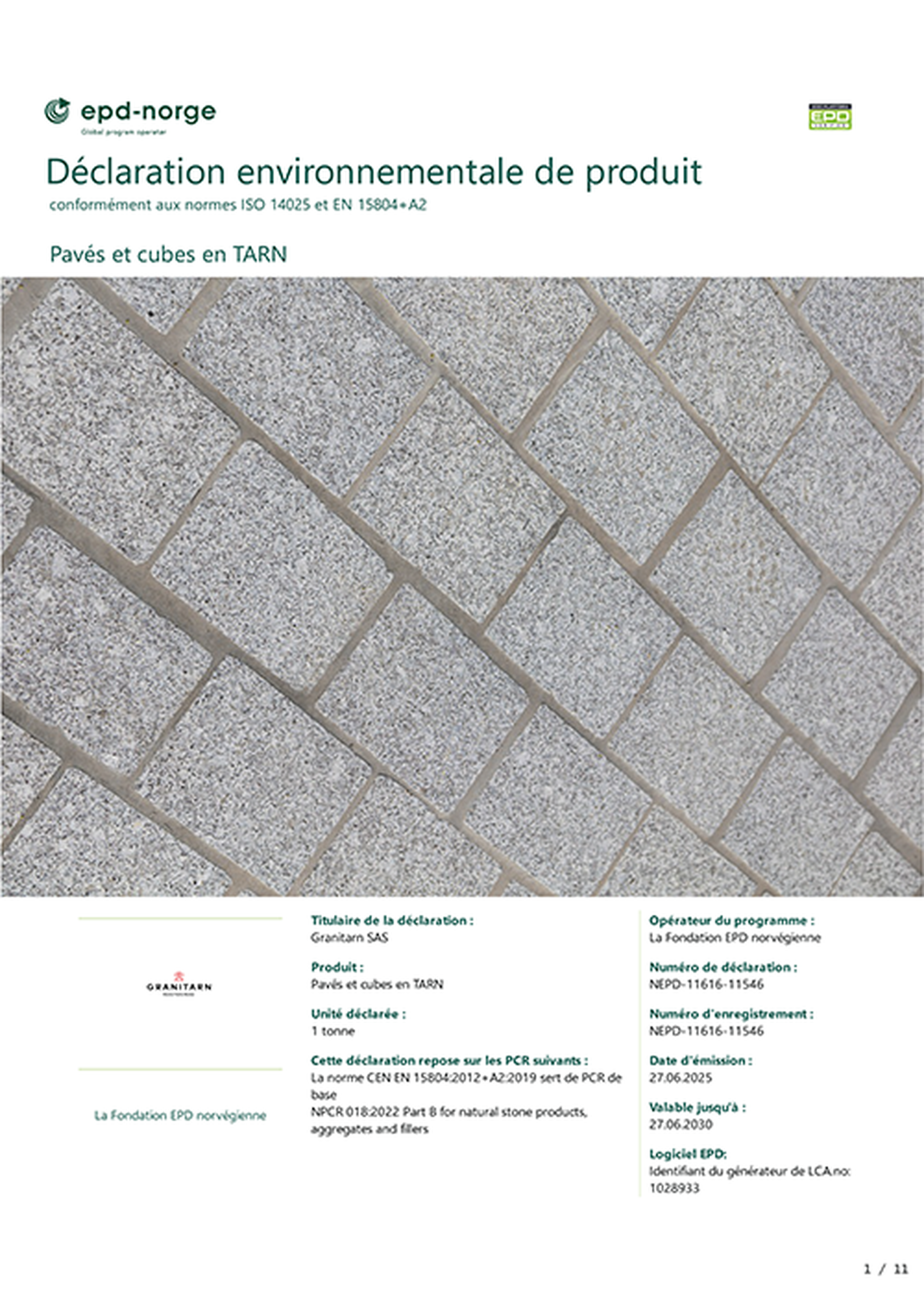 Cette pierre naturelle est recyclable, extrêmement dure et résistante, ce qui en fait une véritable force de la nature. Elle offre une excellente résistance au gel avec plus de 240 cycles – soit presque le double des exigences françaises – garantissant ainsi une longévité supérieure. Avec une résistance à la compression de plus de 190 MPa, soit près du double de la norme pour les pavés de classe 6 (EN 1342), le granit du Tarn assure une solidité et une durabilité exceptionnelles.