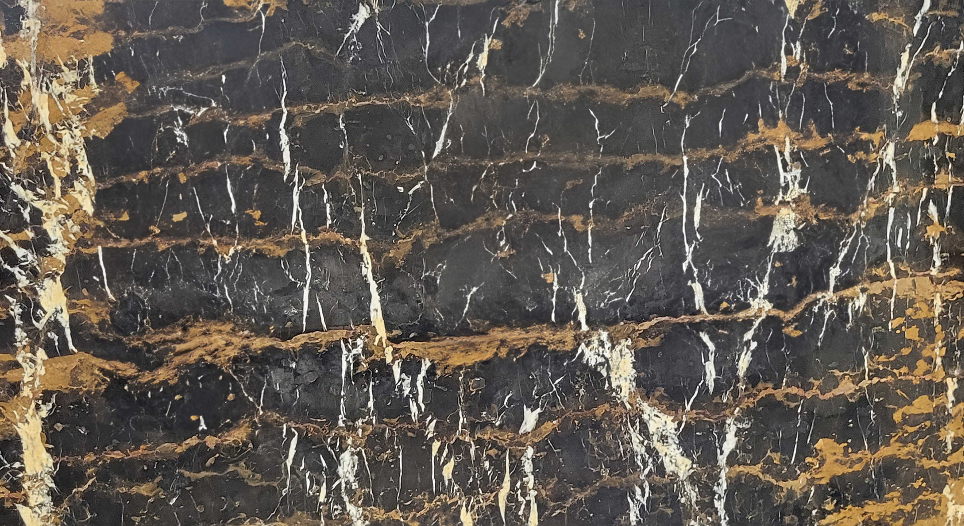 Description:Marbre noir à la surface parsemée de veines « or » frappantes et de concentrations de minéraux. Des veines et concentrations de minéraux blancs peuvent être également visibles.