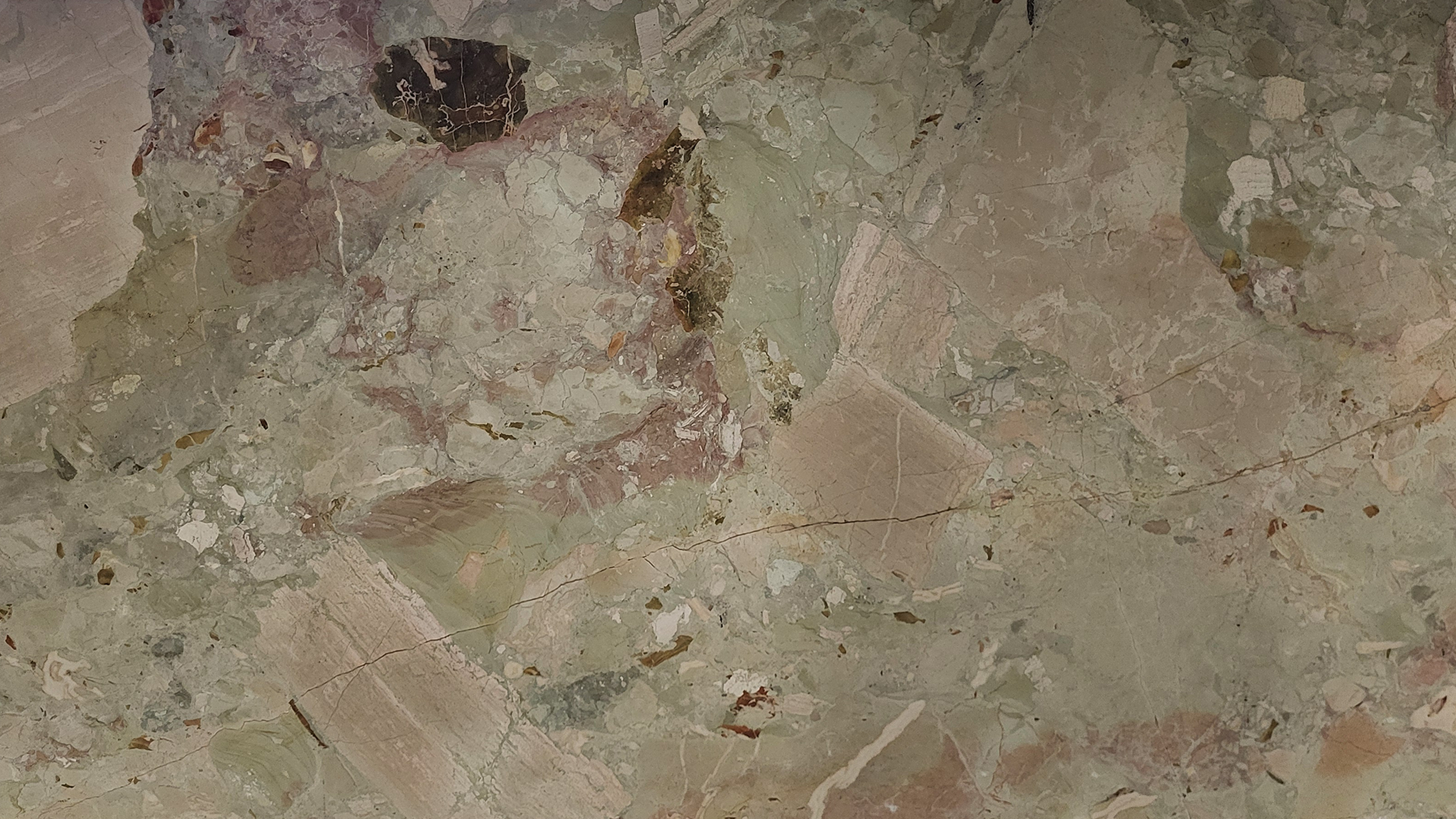 Description:"Marbre" multicolore (couleurs rose-vert-beige) à structure bréchique (veines et fragments anguleux).