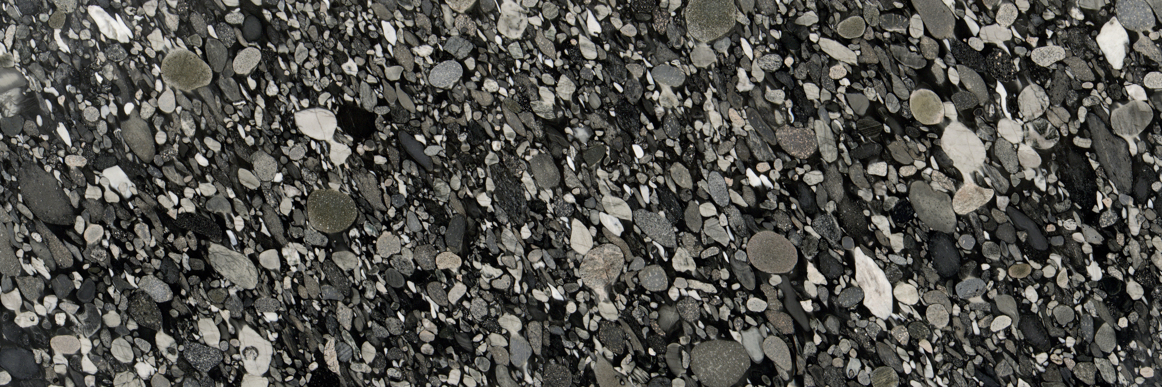 Description:Conglomérat noir dans lequel apparaissent des fragments de différentes couleurs (surtout gris et blanc), dans un fond principalement noir. Les fragments peuvent atteindre jusqu'à 15 cm. Ensemble très hétérogène.