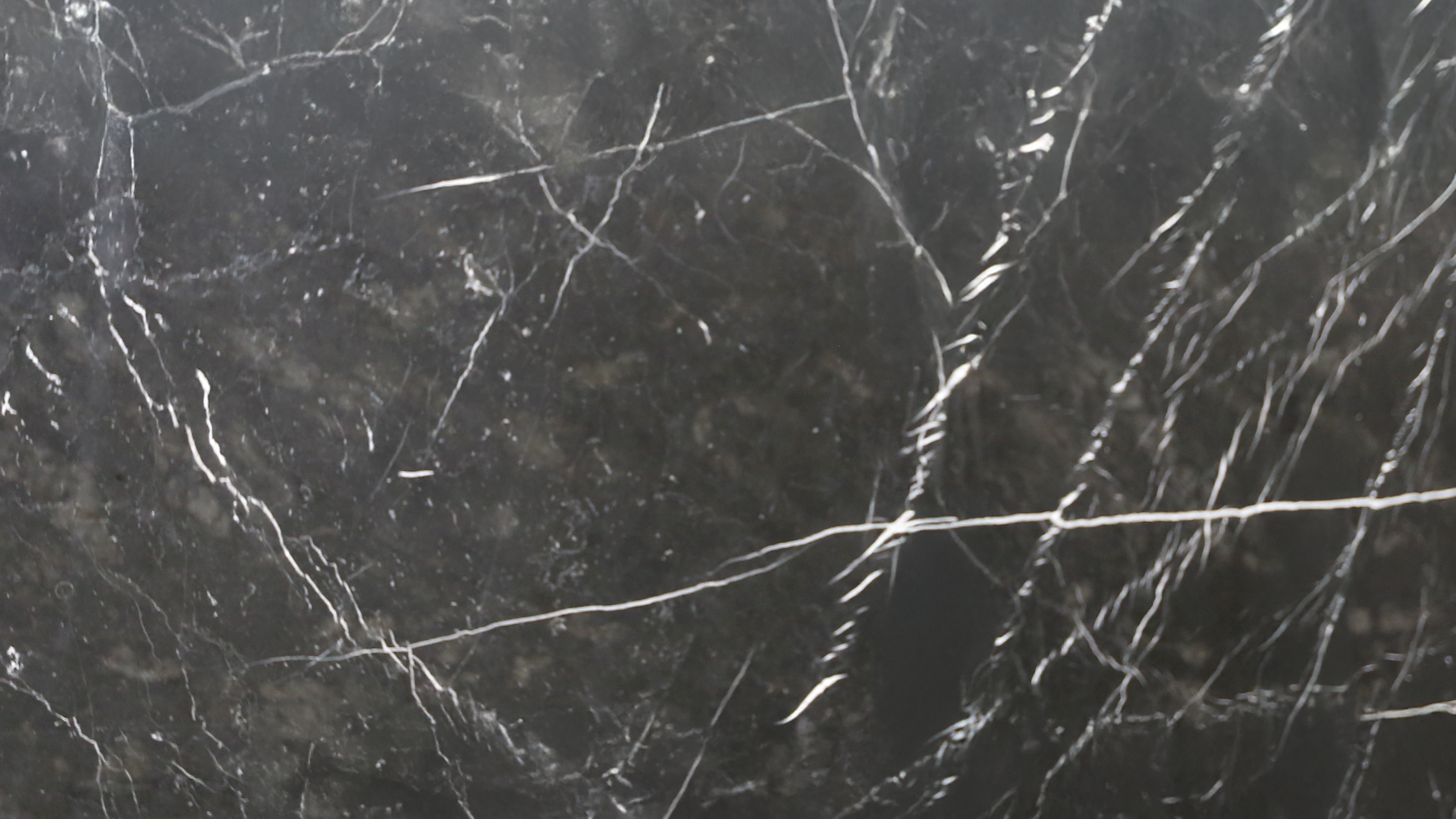 Description:Pierre calcaire espagnole compacte à fin grain avec un fond noir et des veines/fossiles blancs.