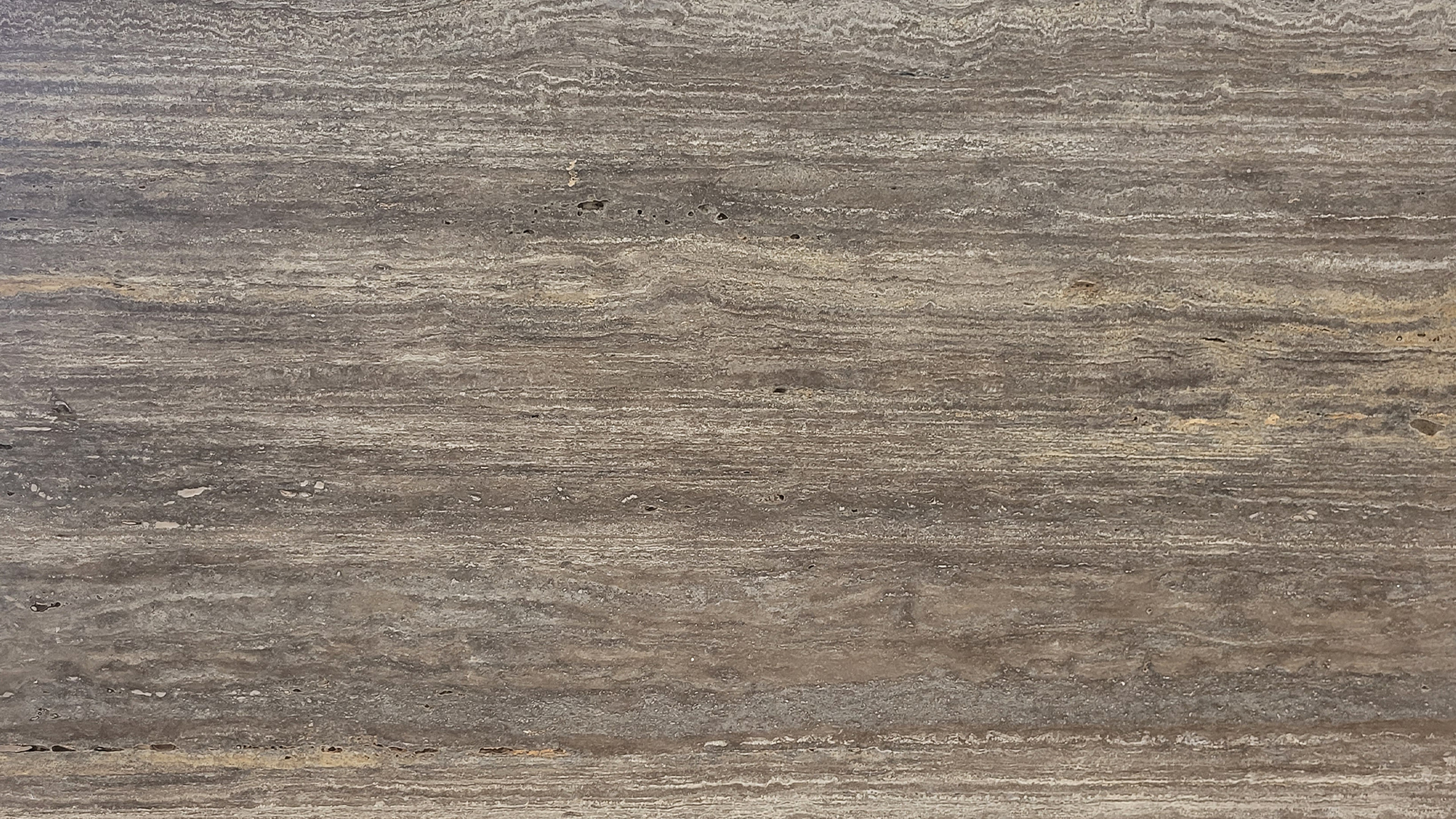 Description:Pierre calcaire compacte de couleur brun-gris (travertin) avec un dessin ligné prononcé en raison de la structure plus sombre des lignes. Le dessin est très hétérogène et principalement en forme de bandes (horizontales et verticales ; tranche sciée perpendiculairement aux couches). La surface contient de petites ouvertures qui sont généralement rebouchées.