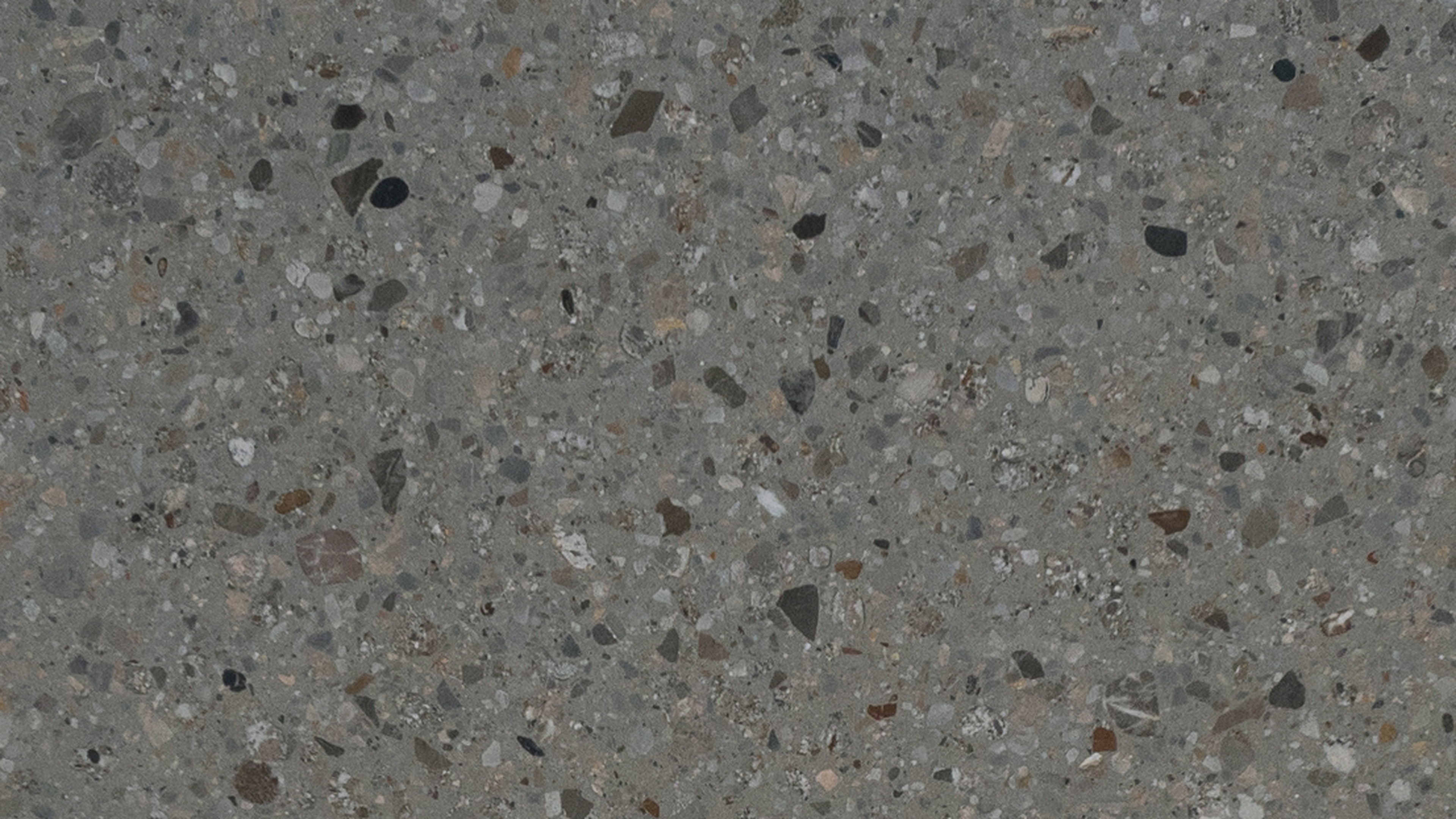 Description:Terrazzo composé de granulés de marbre, de liant à base de ciment et de pigments de couleur dans différentes proportions. Fond de couleur gris clair parsemé de fragments de marbre arrondis et très colorés.