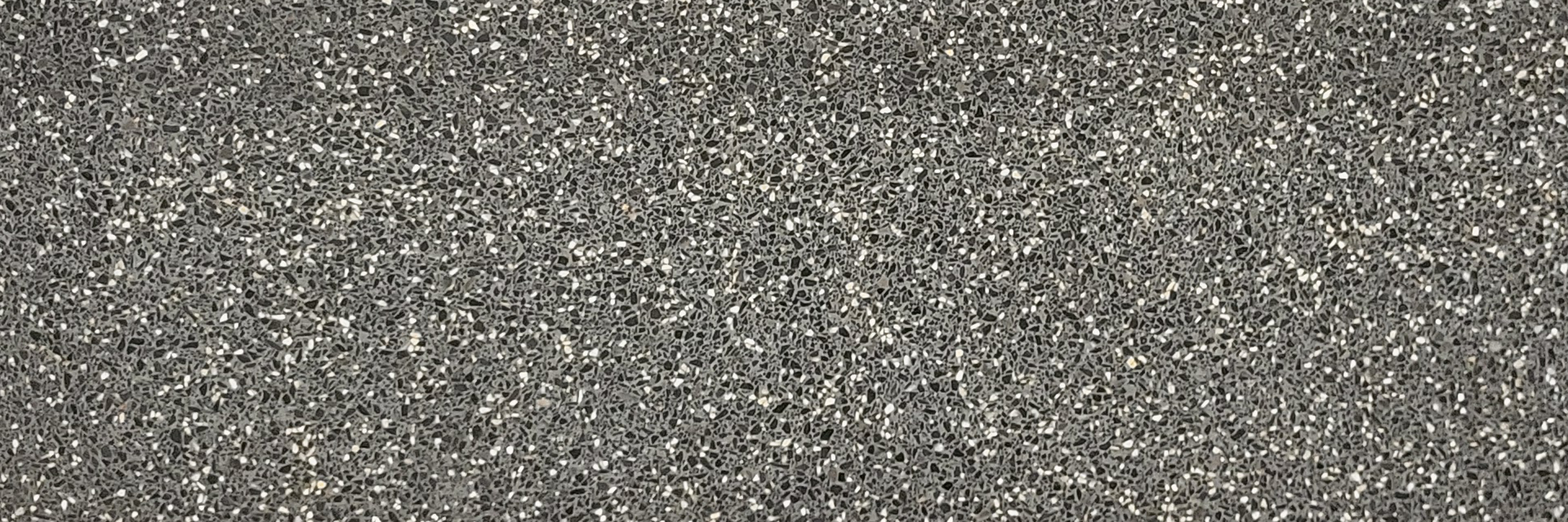 Description:Terrazzo composé de granulés de marbre, de liant à base de ciment et de pigments de couleur dans différentes proportions. Fond de couleur grise parsemé de fragments de marbre arrondis blanc-beige à noirs.