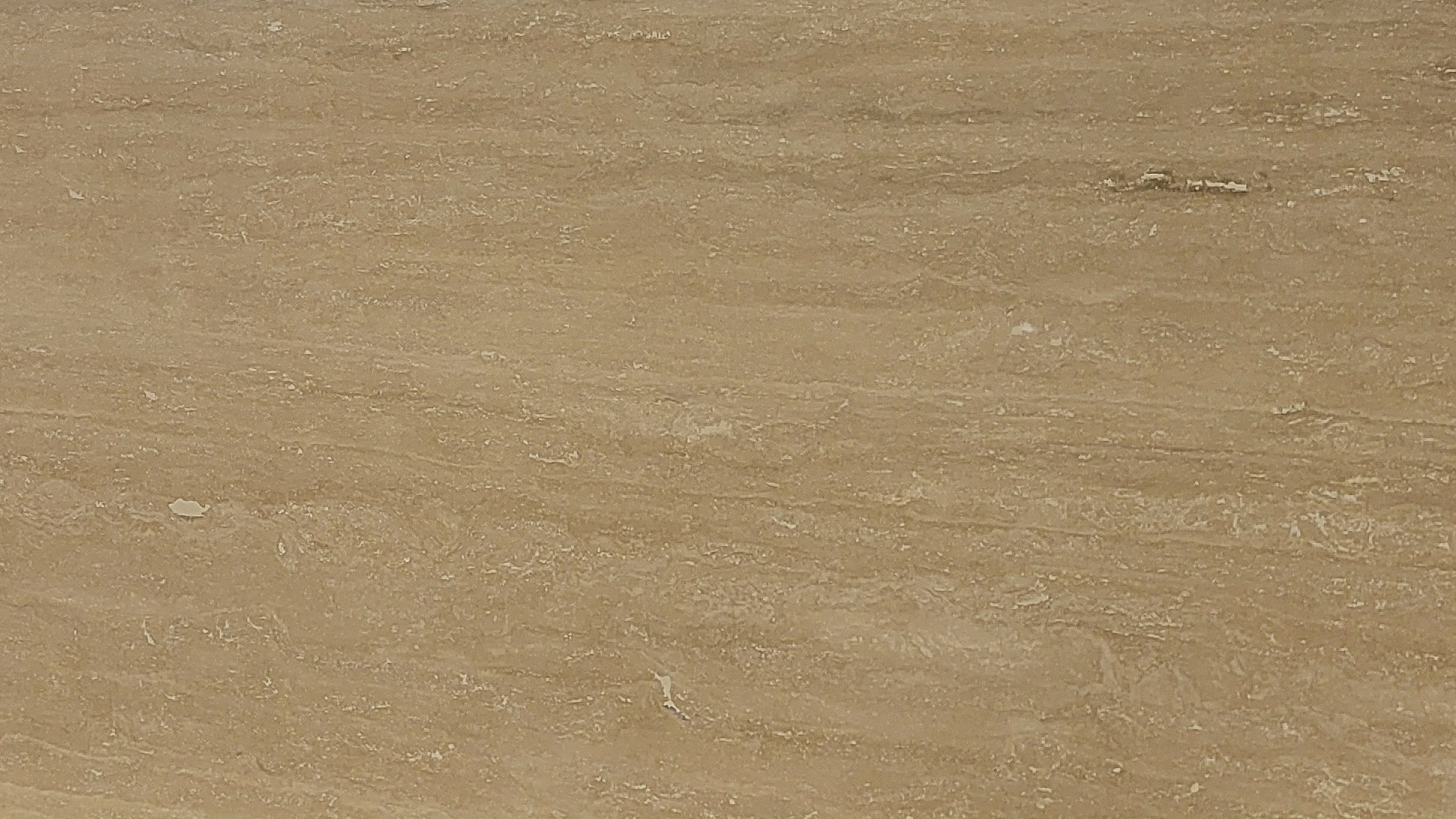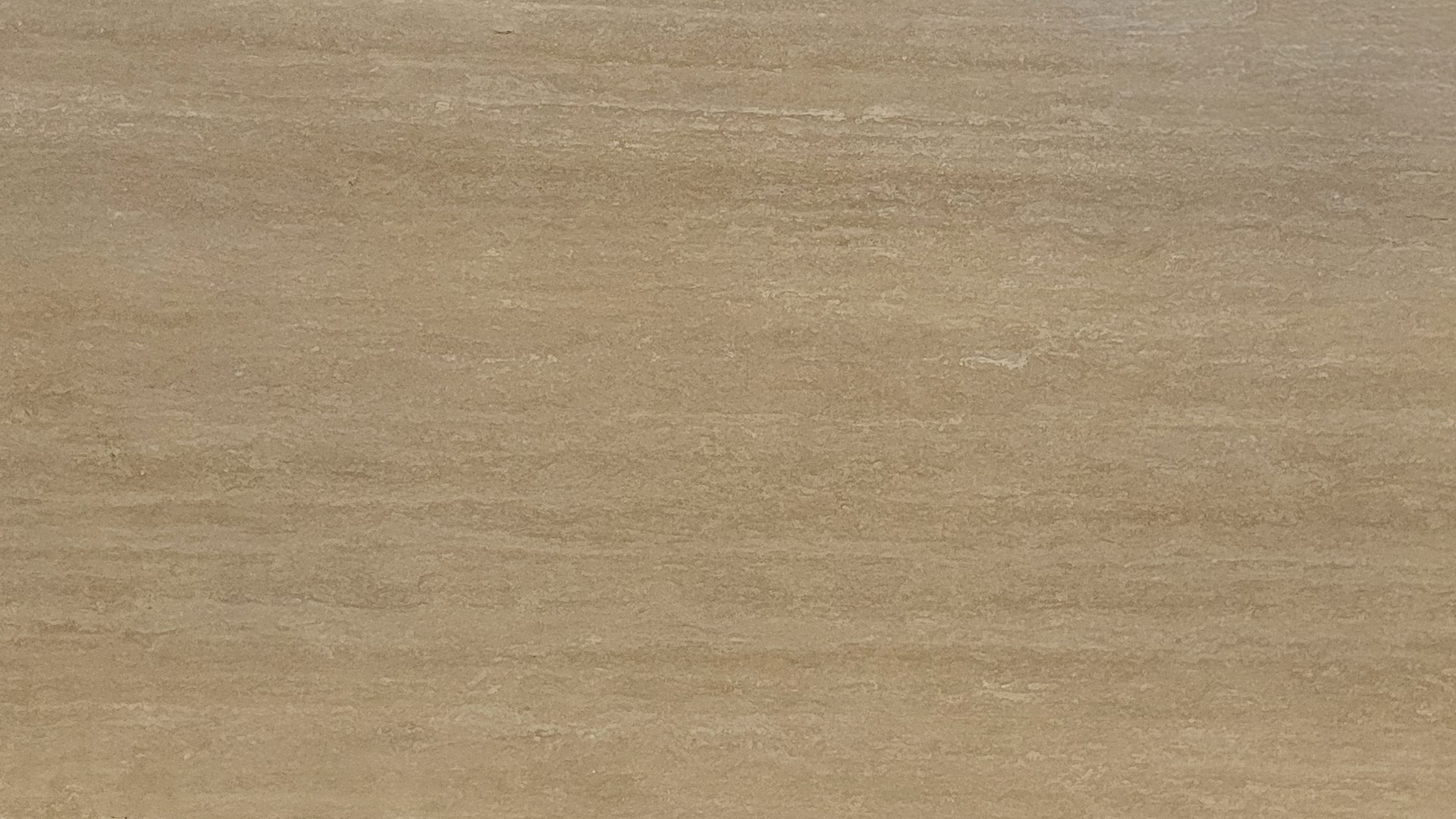 Description:Calcaire compact beige (travertin) au dessin ligné prononcé. Le dessin est très hétérogène et principalement en forme de bandes (horizontales et parallèles ; sciées perpendiculairement aux stratifications). La surface comporte de petites ouvertures qui sont remplies ou non selon la demande.