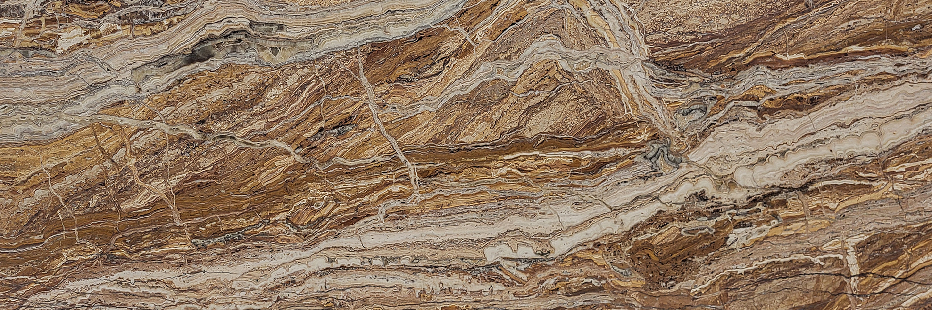 Description:Marbre beige-orange/marron et blanc avec structure en travertin (dessin ligné prononcé en raison de la structure des lignes plus foncées). Le dessin est très hétérogène et principalement en forme de bandes (horizontales et parallèles ; sciées perpendiculairement aux stratifications).