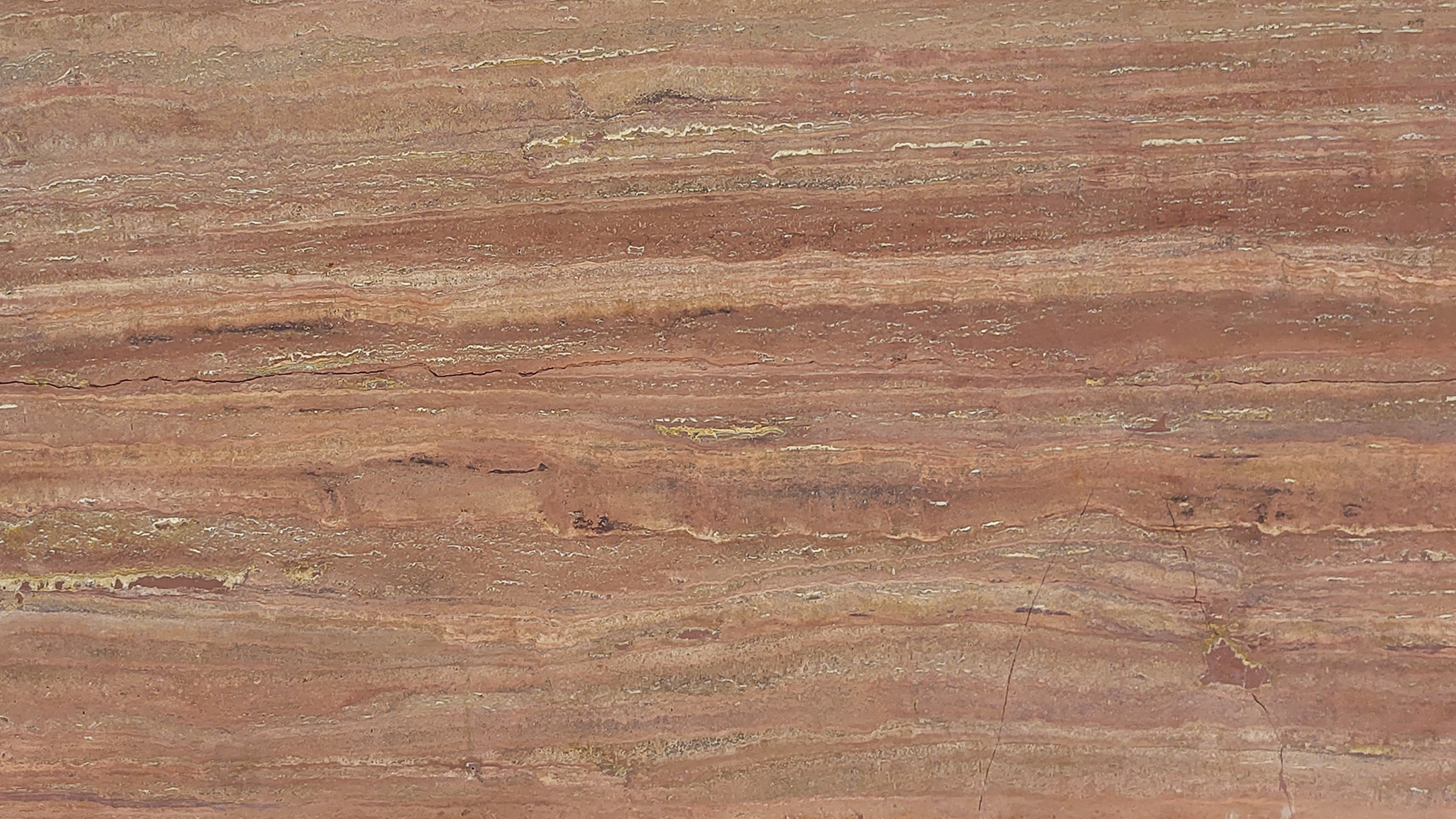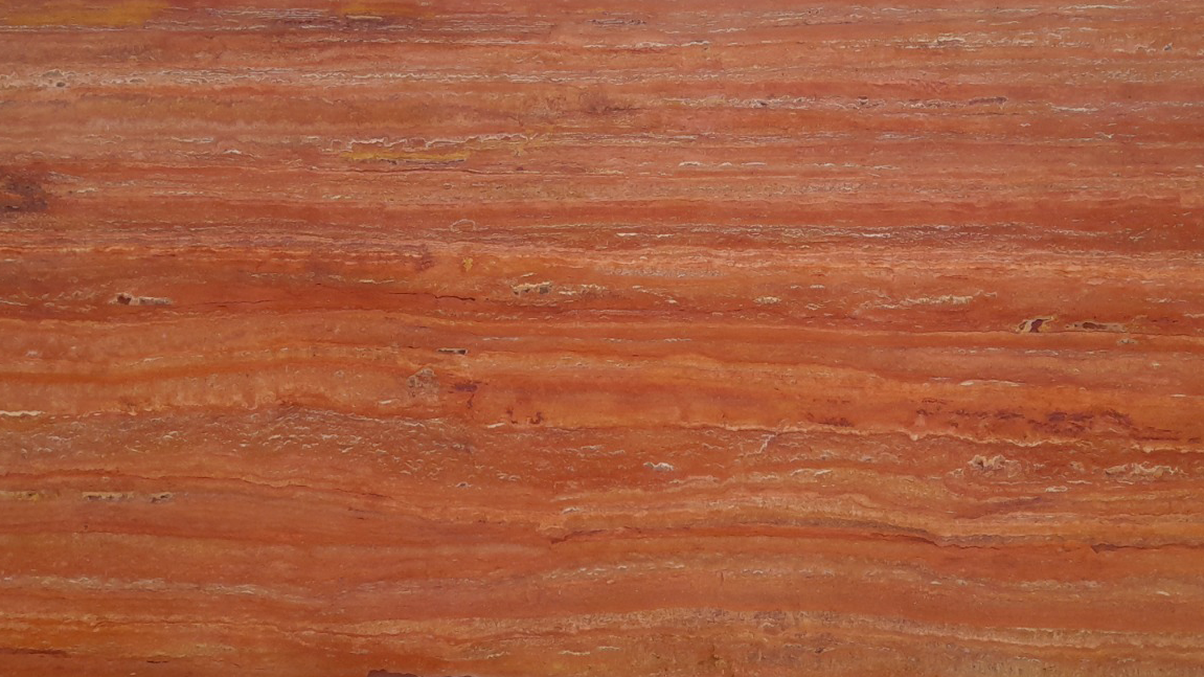 Description:Structure typique du travertin ; pierre rouge à grain relativement fin, parfois parsemé de zones rouge clair à gris.