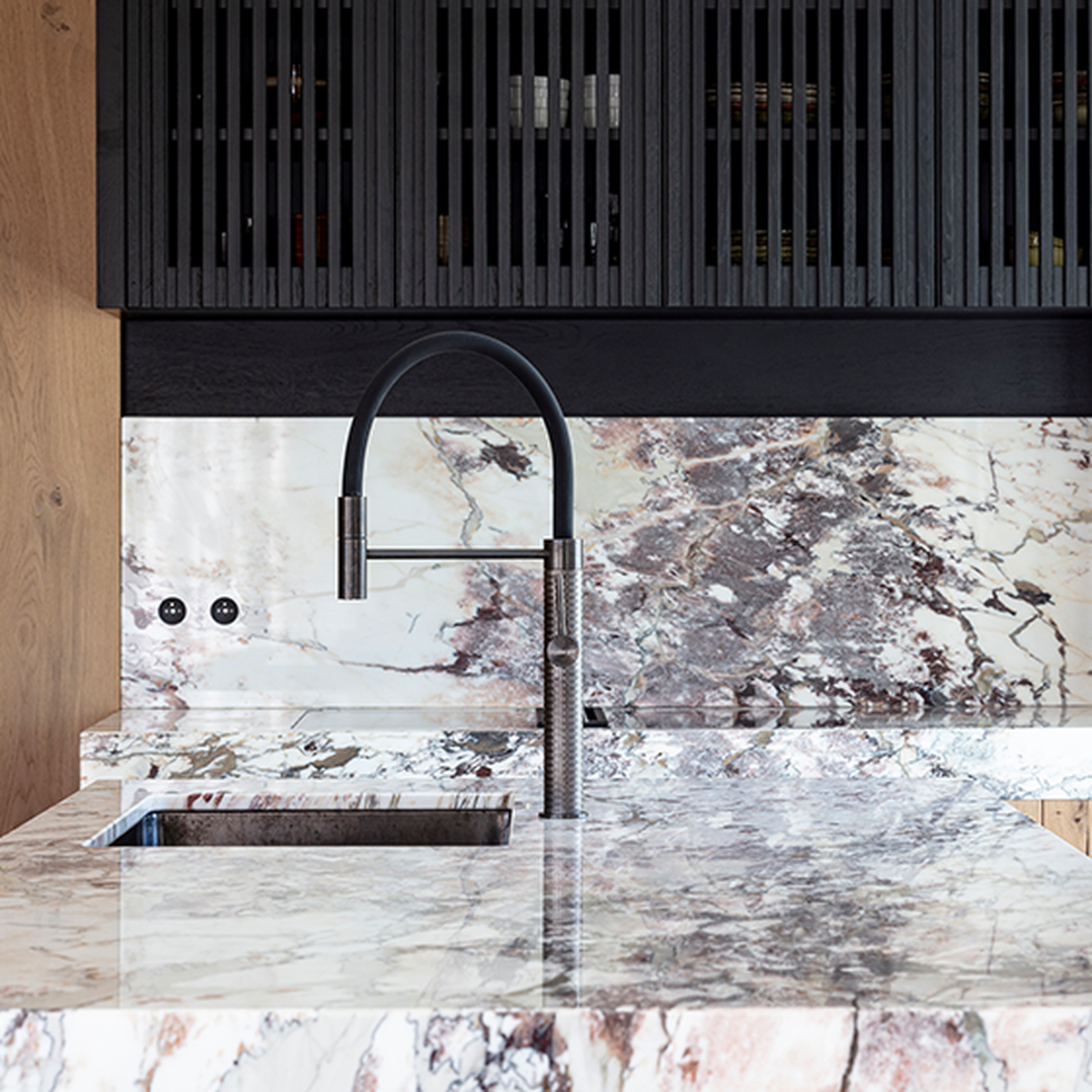 Consigliamo inoltre di optare per una lastra di marmo chiara e più movimentata (eterogenea). I marmi scuri e omogenei mostrano più rapidamente macchie e graffi.