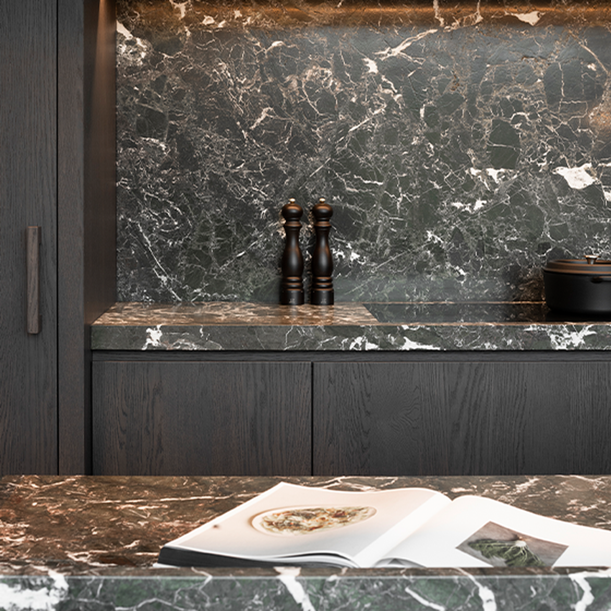 Il marmo si evolve con la tua cucina. Grazie al naturale processo di patinatura, la lastra acquista più fascino con gli anni e sviluppa un bellissimo aspetto vissuto di cui godrai a lungo.