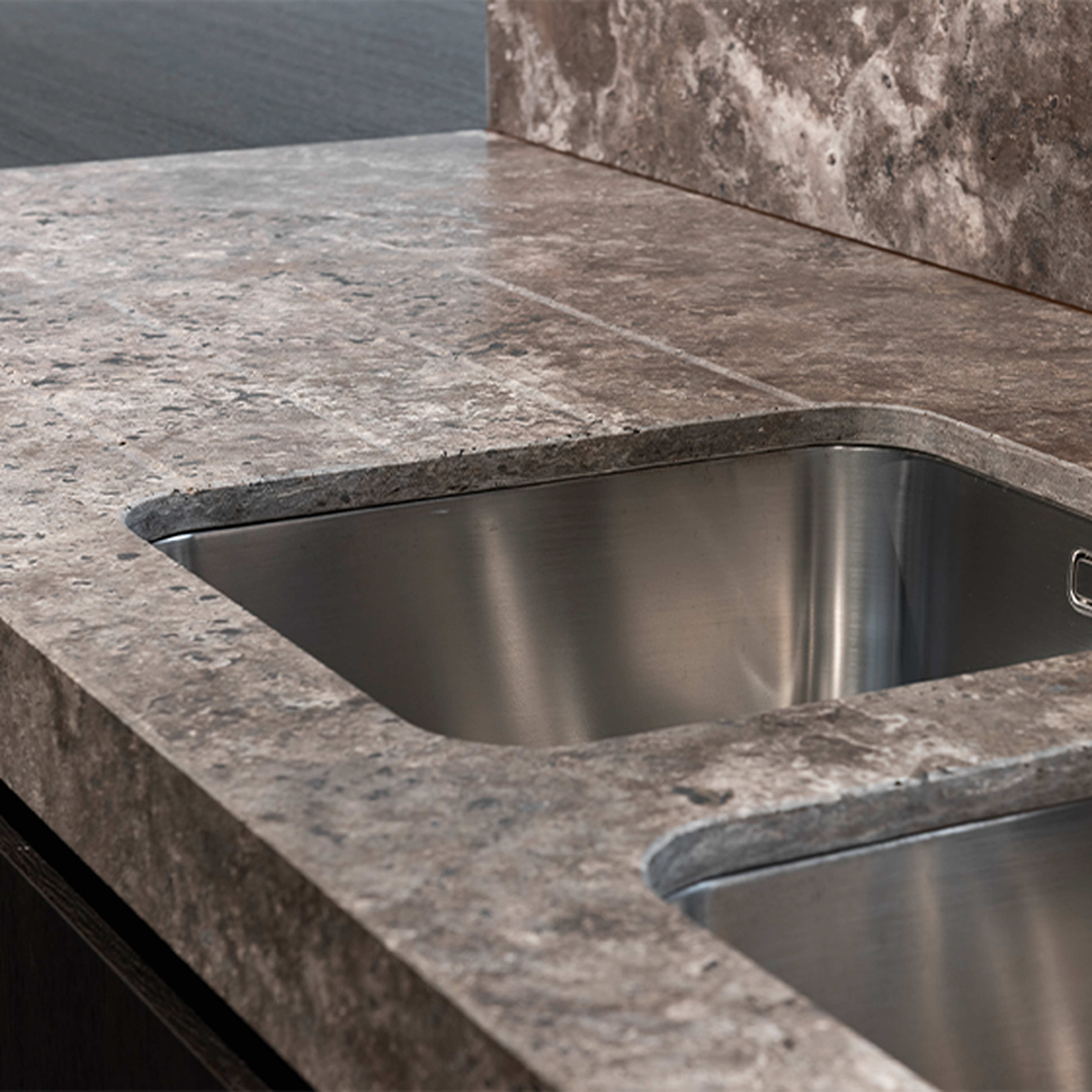 Poiché il travertino è un limestone ed è più poroso del marmo, la sigillatura è essenziale, soprattutto in ambienti interni, in zone sensibili a macchie e umidità come la cucina. Per questo consigliamo Lithofin MN Stain-Stop. La manutenzione quotidiana con prodotti adeguati aiuta a mantenere il piano di lavoro più a lungo resistente alle macchie e bello da vedere. Il travertino non stuccato è meno pratico da mantenere ed è anche meno durevole, per questo non ne consigliamo questa applicazione.