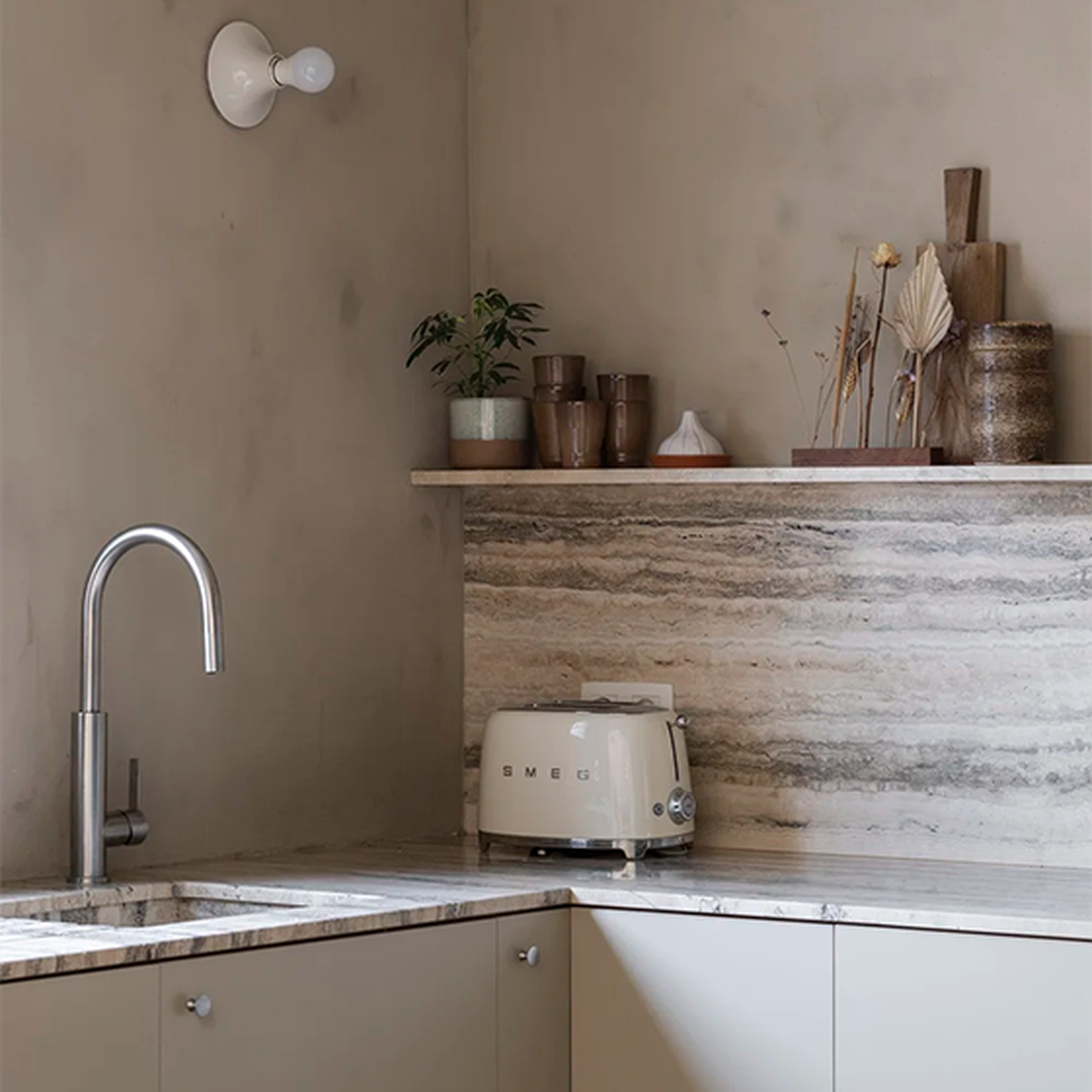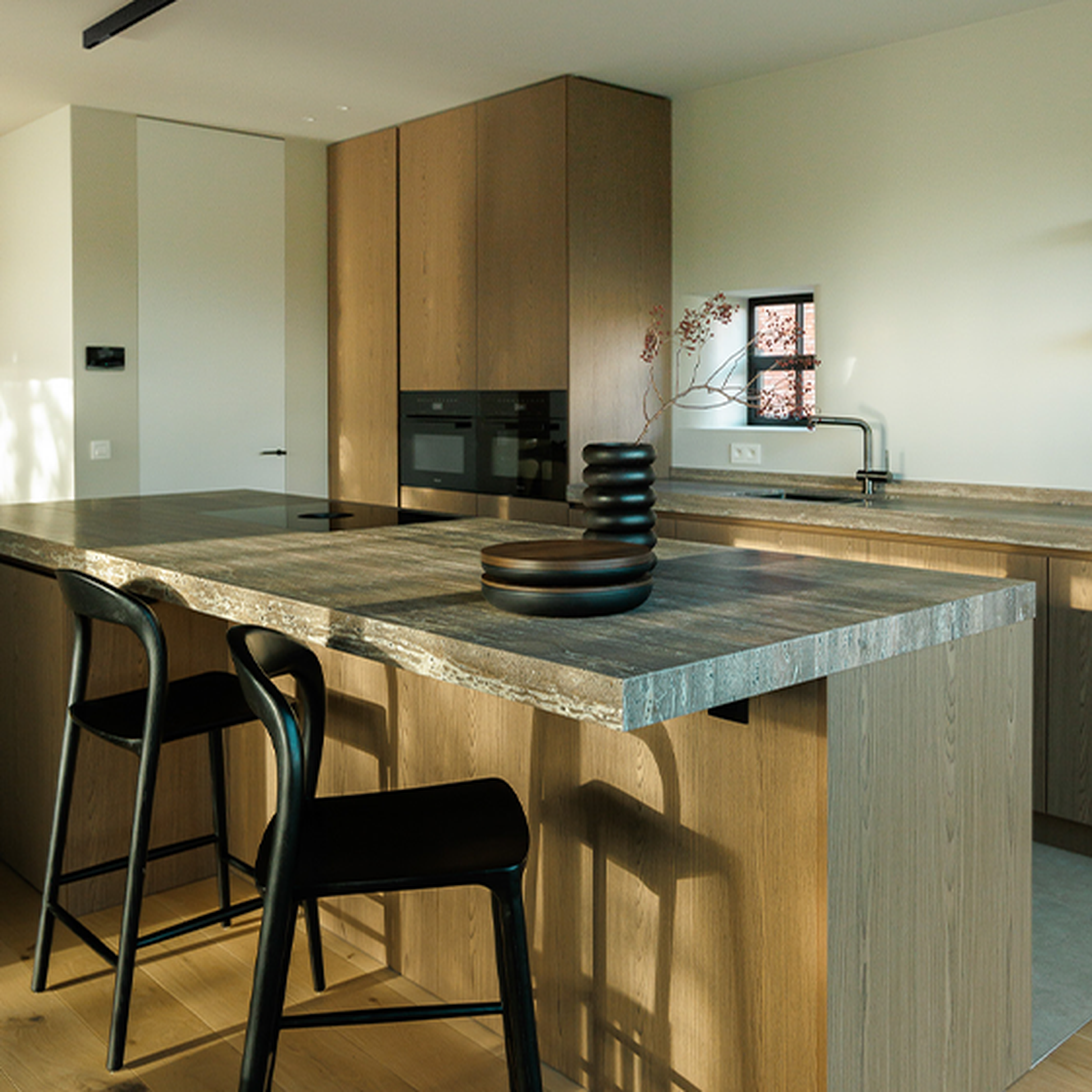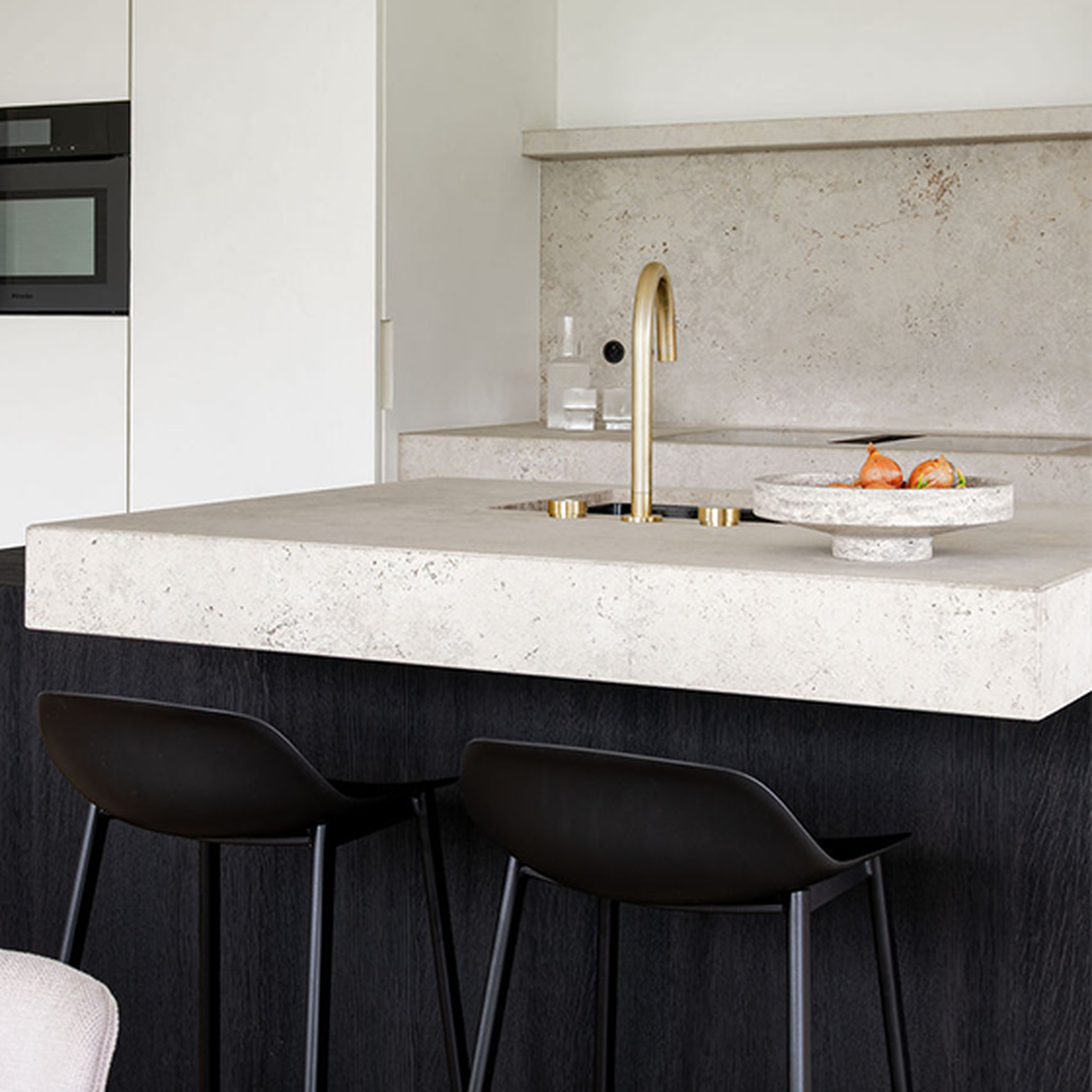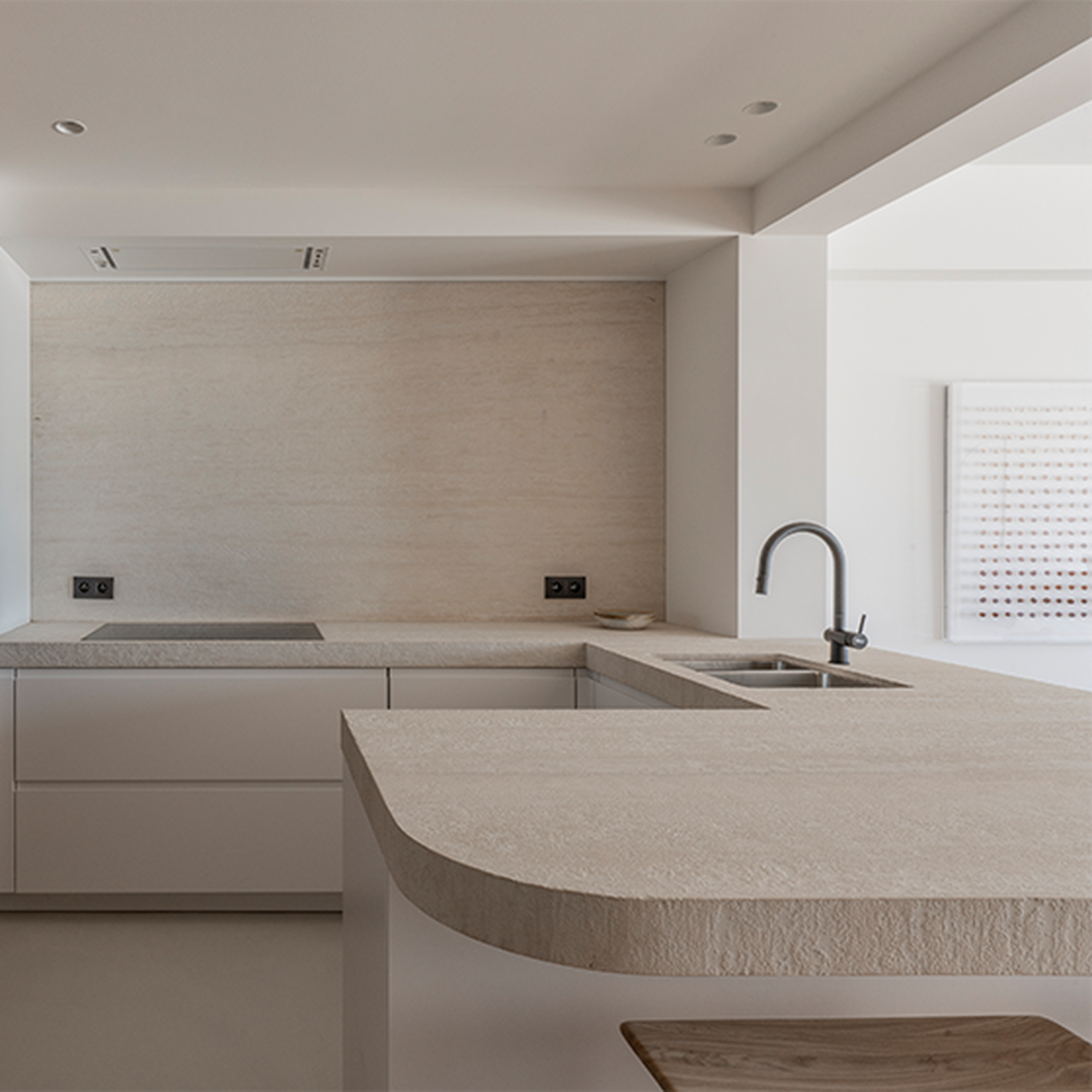 Il travertino dona alla cucina un’atmosfera calda e naturale, ma come pietra naturale richiede la giusta protezione e manutenzione. Per questo Uniceramica® propone piani di lavoro in gres porcellanato effetto travertino, che offrono la stessa atmosfera senza le preoccupazioni legate a una pietra porosa.