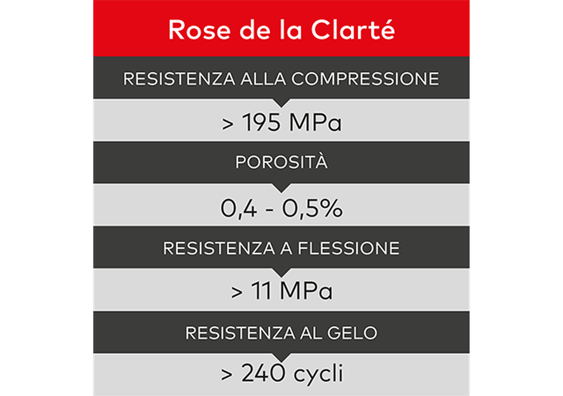 La resistenza al gelo del Rose de la Clarté supera i 240 cicli di gelo-disgelo (EN 12371), conseguenza diretta della sua struttura granitica densa, intrinseca al materiale e indipendente dal trattamento superficiale. Consideriamo questa soglia il minimo responsabile per le pavimentazioni in spazi pubblici in climi esposti al gelo con uso strutturale di sale antigelo. Qualsiasi pietra che non raggiunga regolarmente questo valore presenta un rischio concreto di degrado prematuro della superficie negli spazi pubblici ad uso intensivo.