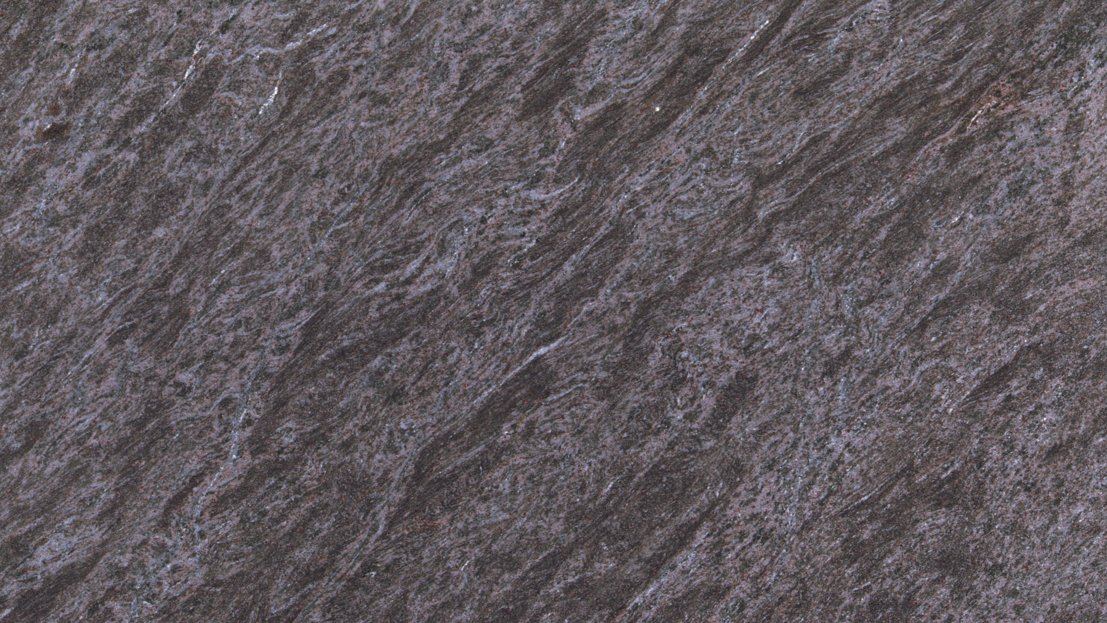 Descrizione:Granito color porpora-bluastro con fasce ondulate scure o più chiare e costellato di minerali color borgogna (granata). La struttura è orientata e sono presenti figure plissé. Roccia a grana fine o moderatamente fine.