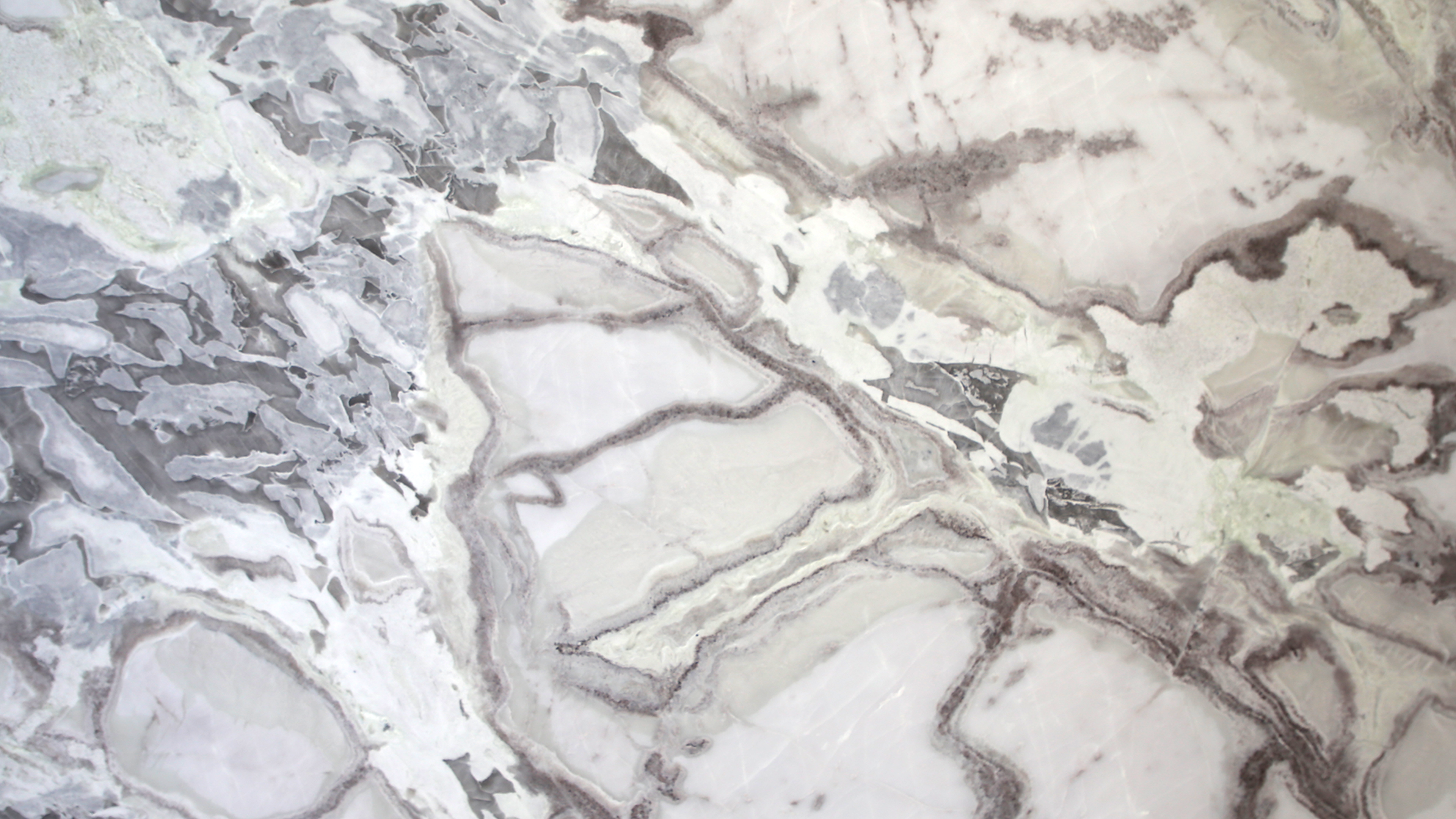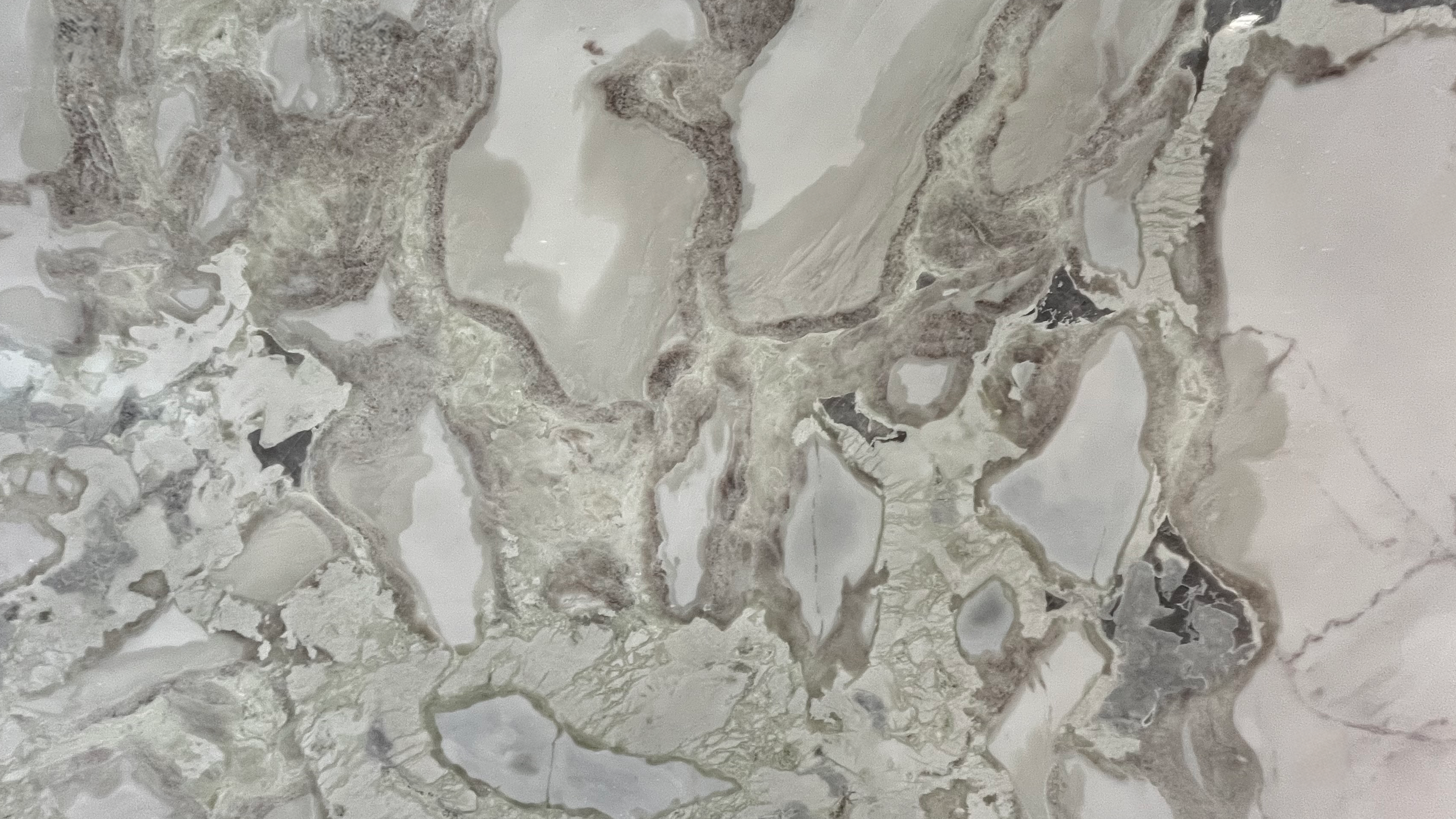 Descrizione:“Marmo” bianco-grigio con una superficie costellata di frammenti irregolari di colore più scuro.