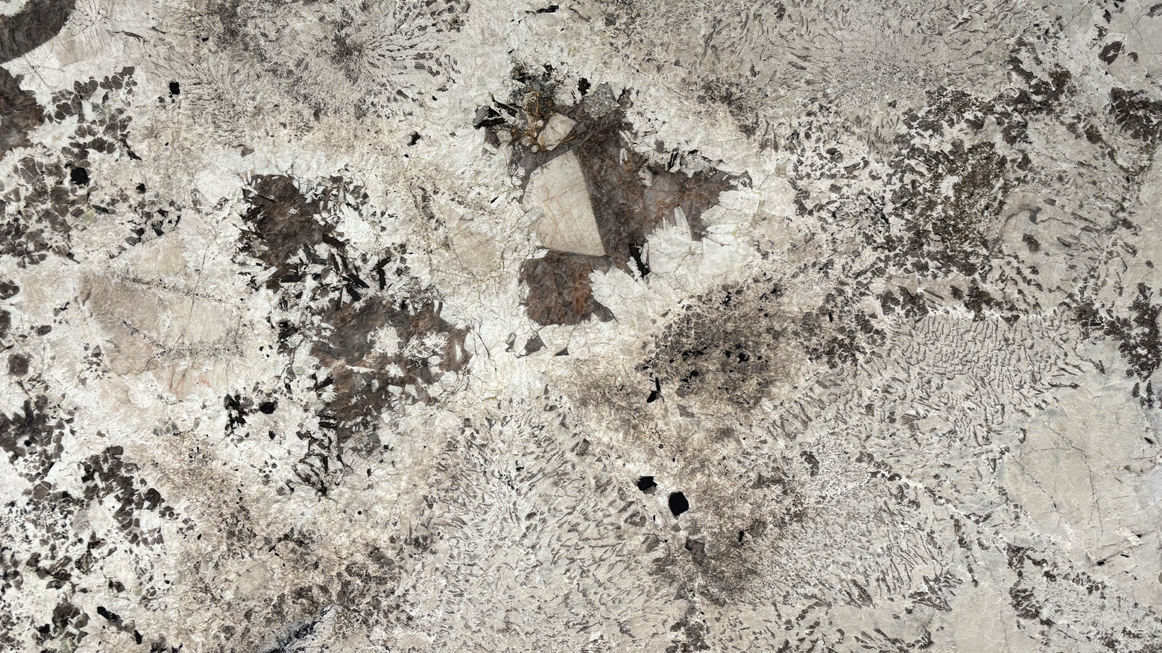 Descrizione:"Granito" a grana grossa, di colore prevalentemente bianco. Grandi cristalli di feldspato e mica nera sono sparsi sulla superficie.