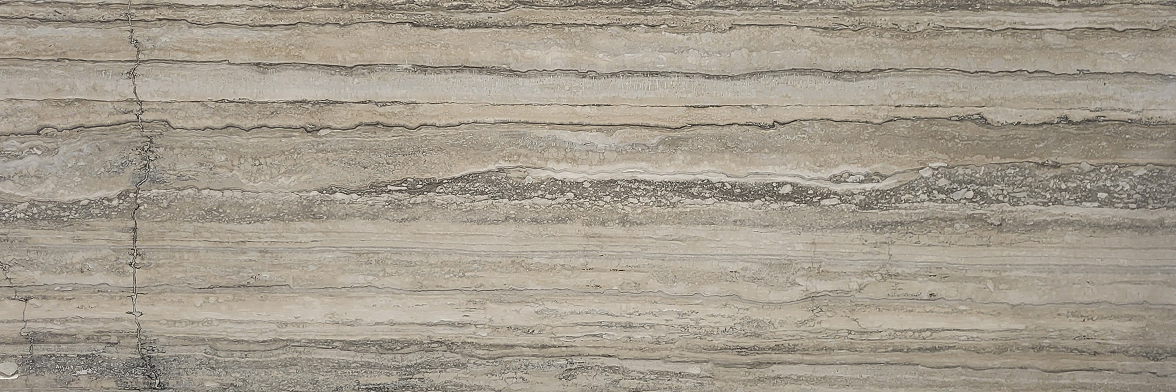 Descrizione:Limestone compatto (travertino) con una colorazione che va dal beige al grigio-beige con una marcata striatura, grazie ad una struttura composta da linee più chiare e più scure. Il motivo striato è particolarmente eterogeneo (fasce orizzontali e parallele; taglio perpendicolare alla stratificazione). La superficie presenta piccole fessure solitamente riempite.