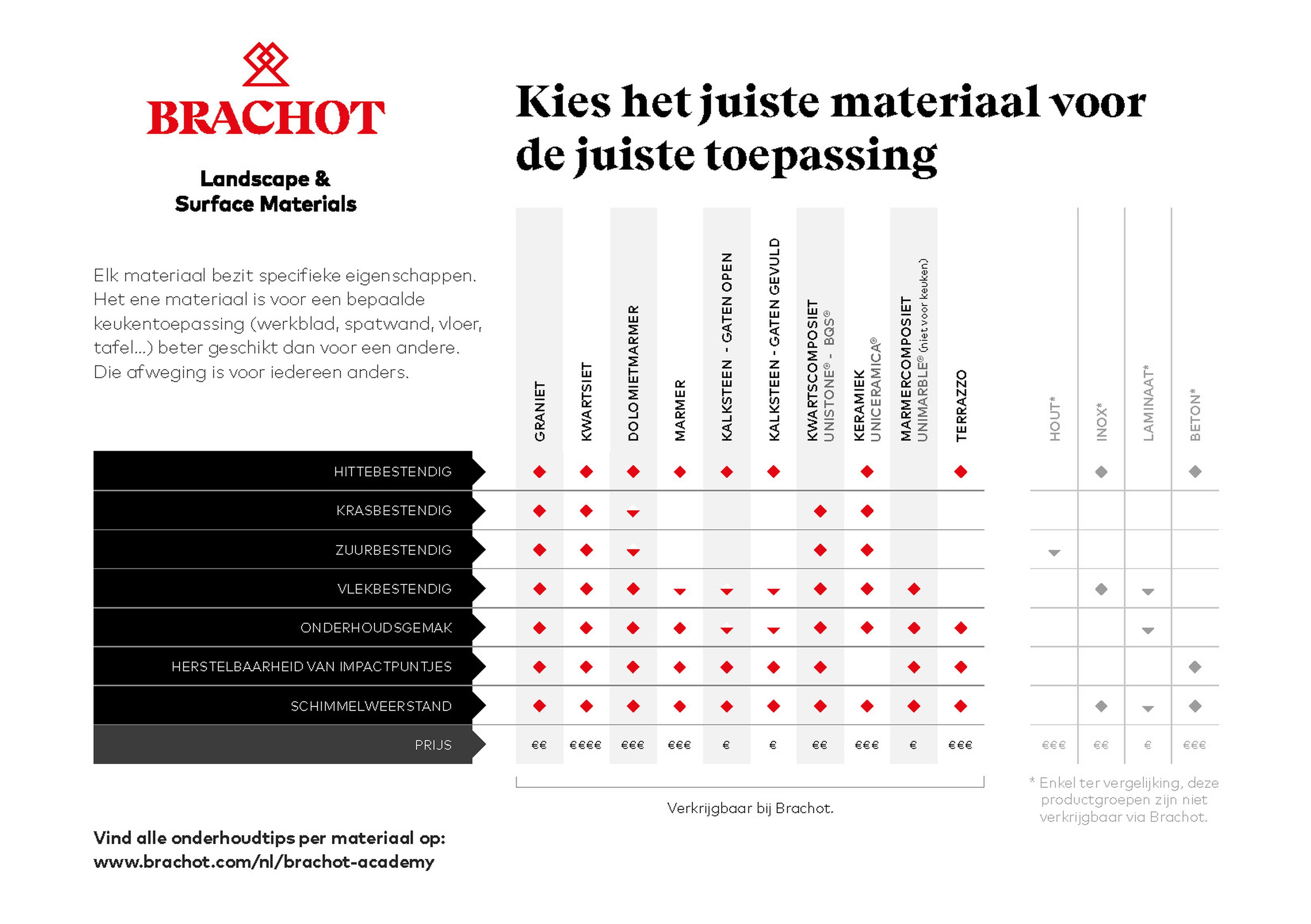 - Kies de juiste steen in functie van de toepassing. In keukens of badkamers is het belangrijk om een materiaal te kiezen met de juiste vlekbestendigheid en oppervlakte-afwerking.