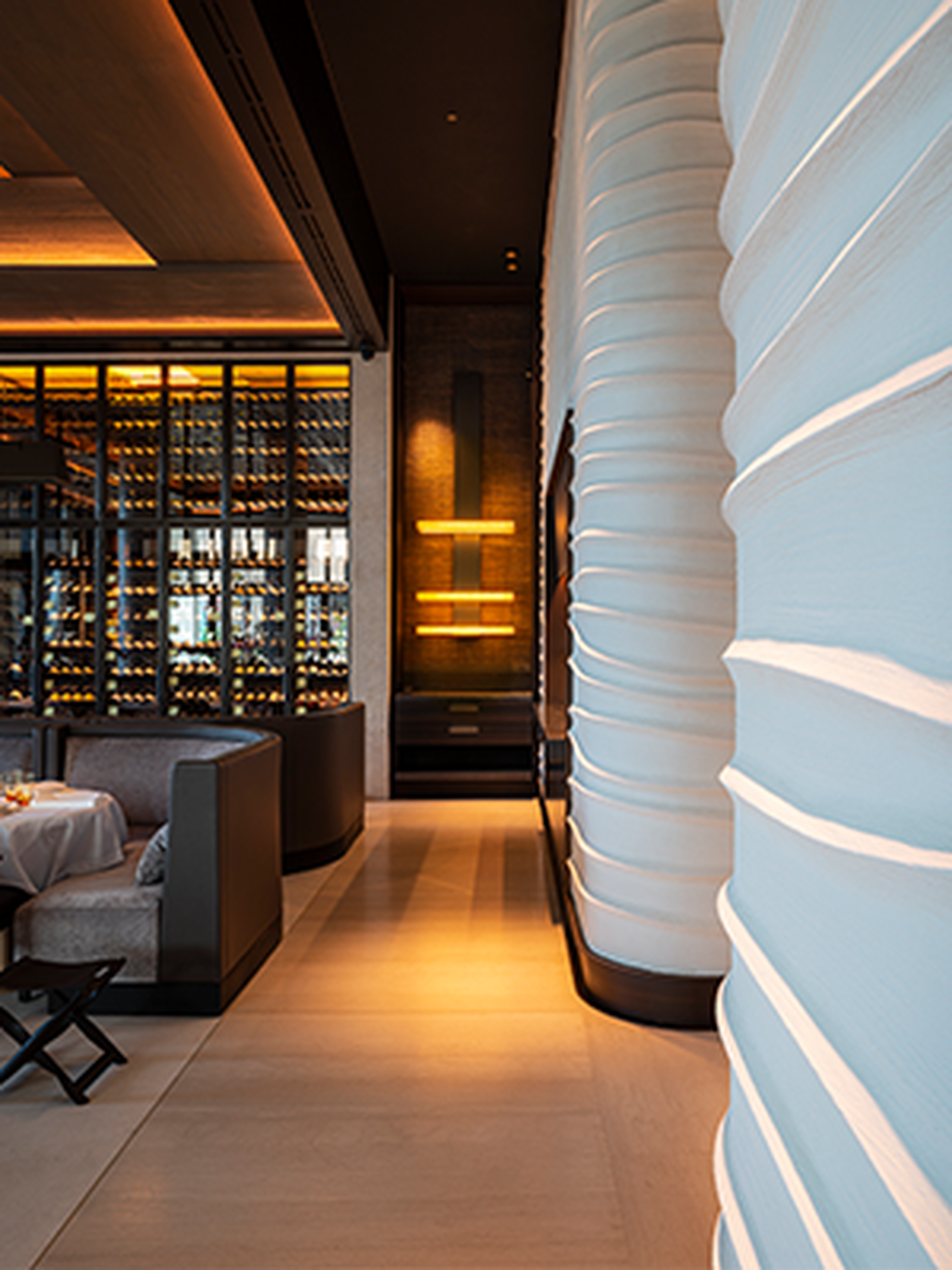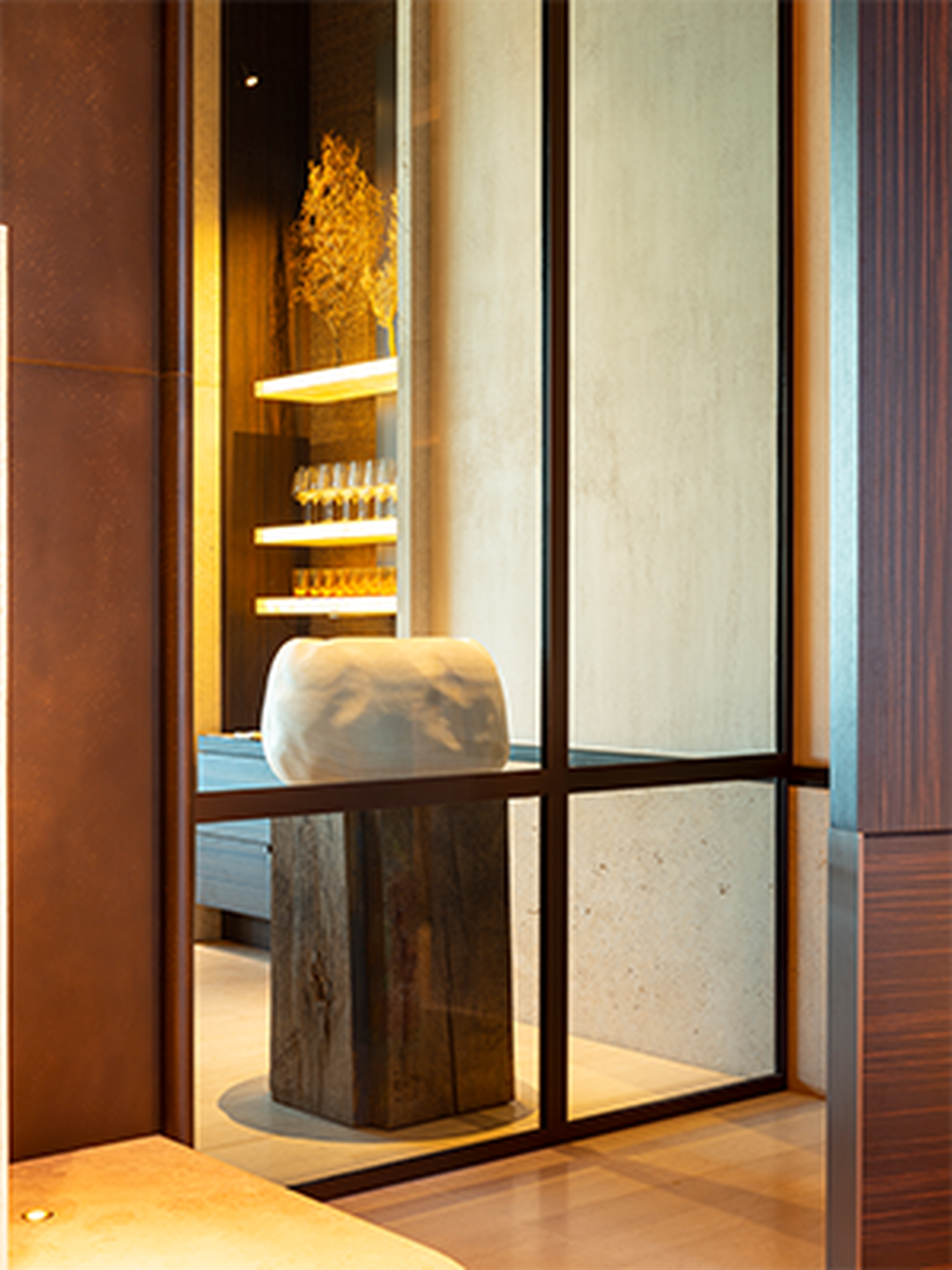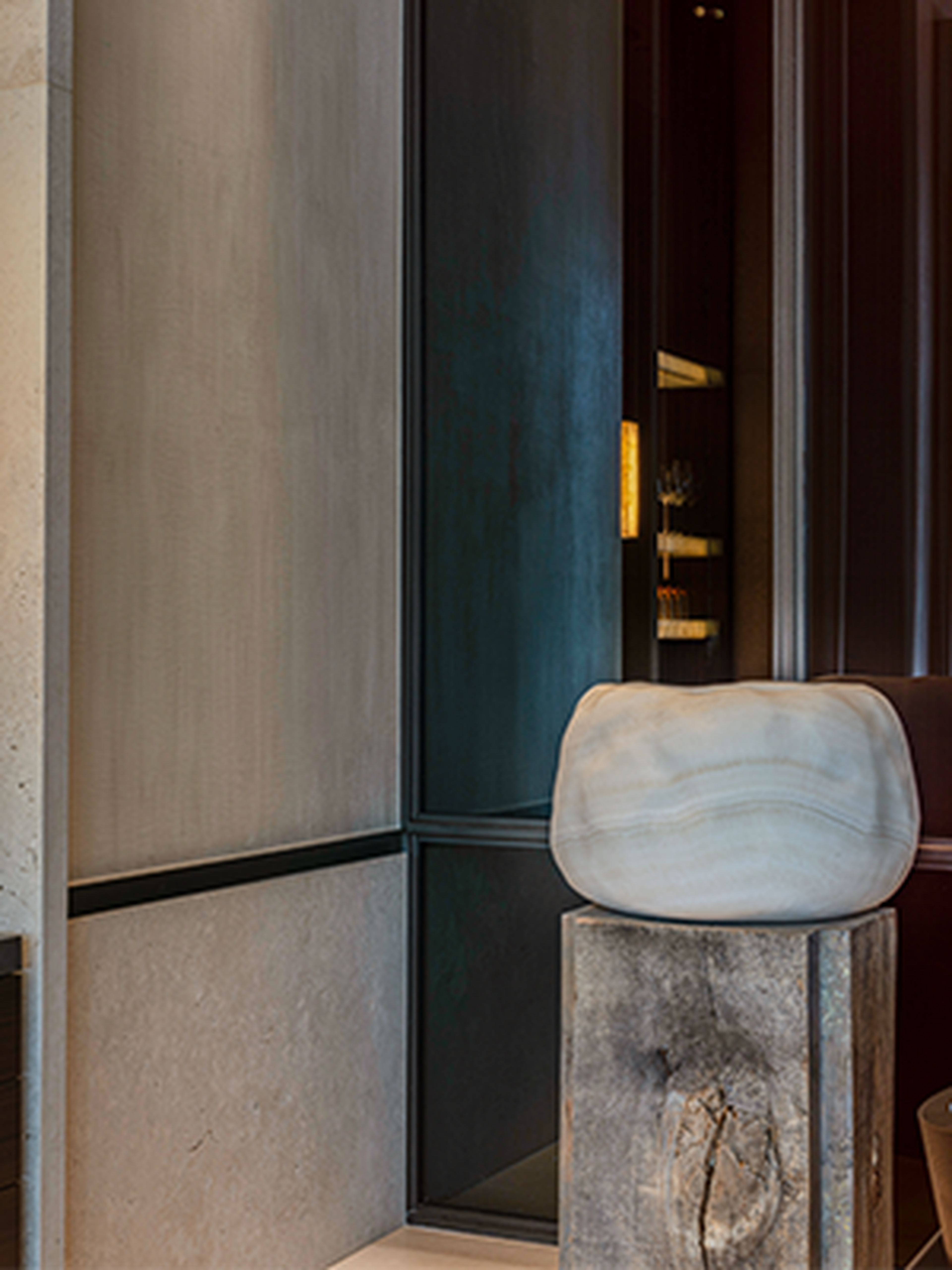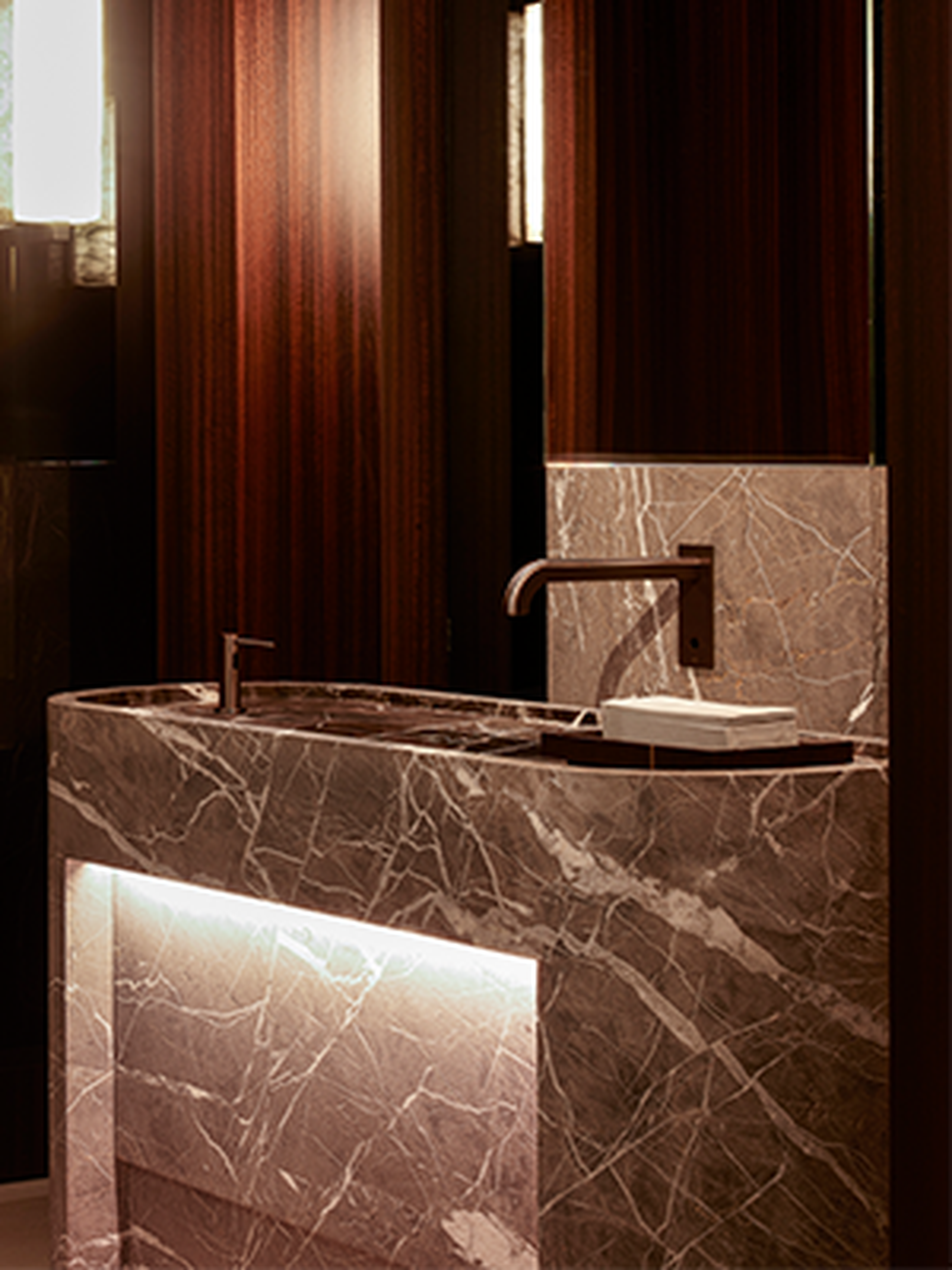 En ja, zelfs je handen wassen is een ervaring op zich in La Réserve. De Marron Napoleon wandbekleding vormt een elegante aanvulling op de White Onyx wastafel, resulterend in een fascinerend samenspel van licht en schaduw. De met de hand vervaardigde, op maat gemaakte wastafels, het op maat gemaakte verlichtingsontwerp, de planken en de champagnekoelers, allemaal vervaardigd uit White Onyx, zijn niet te missen.
