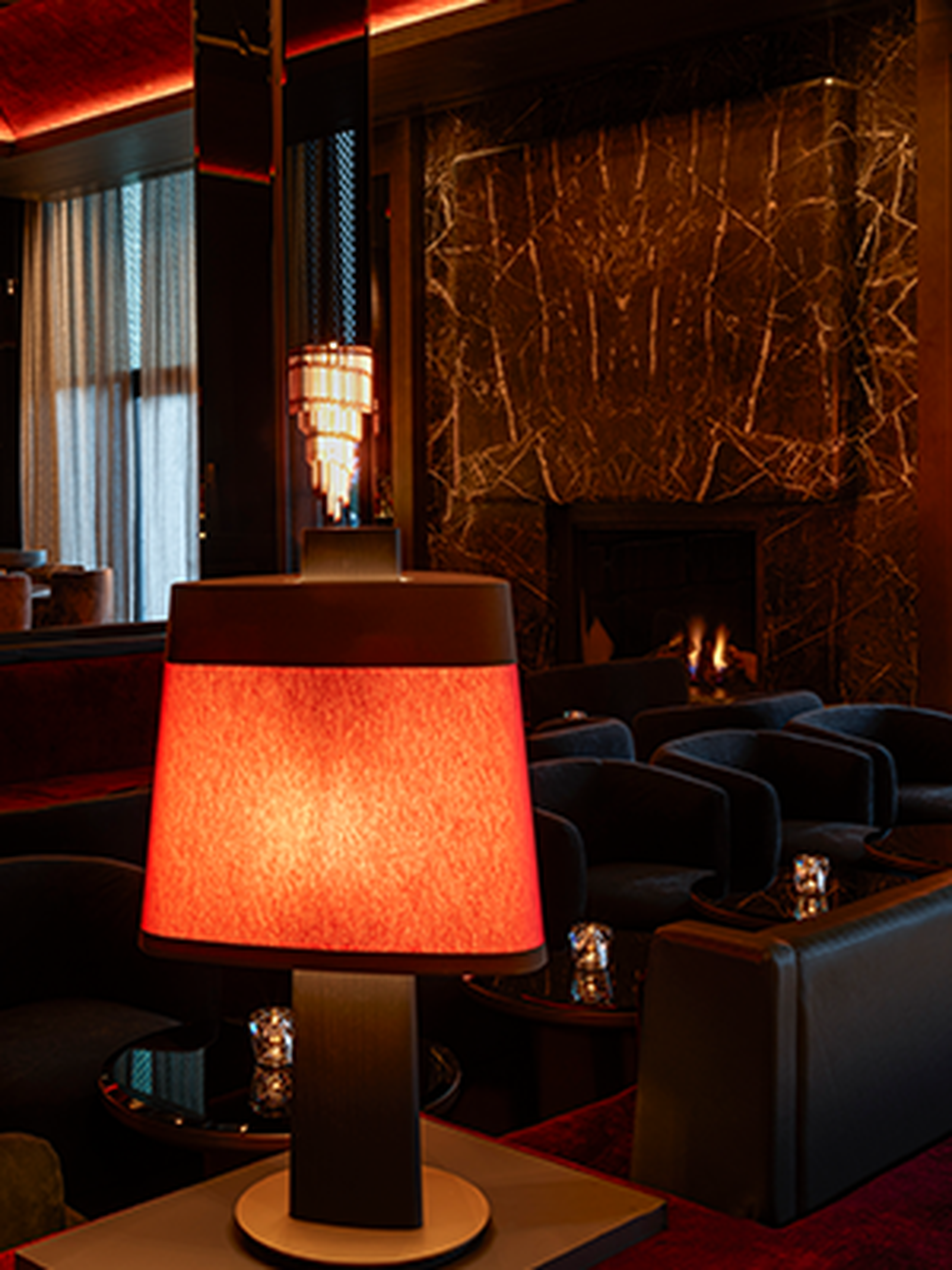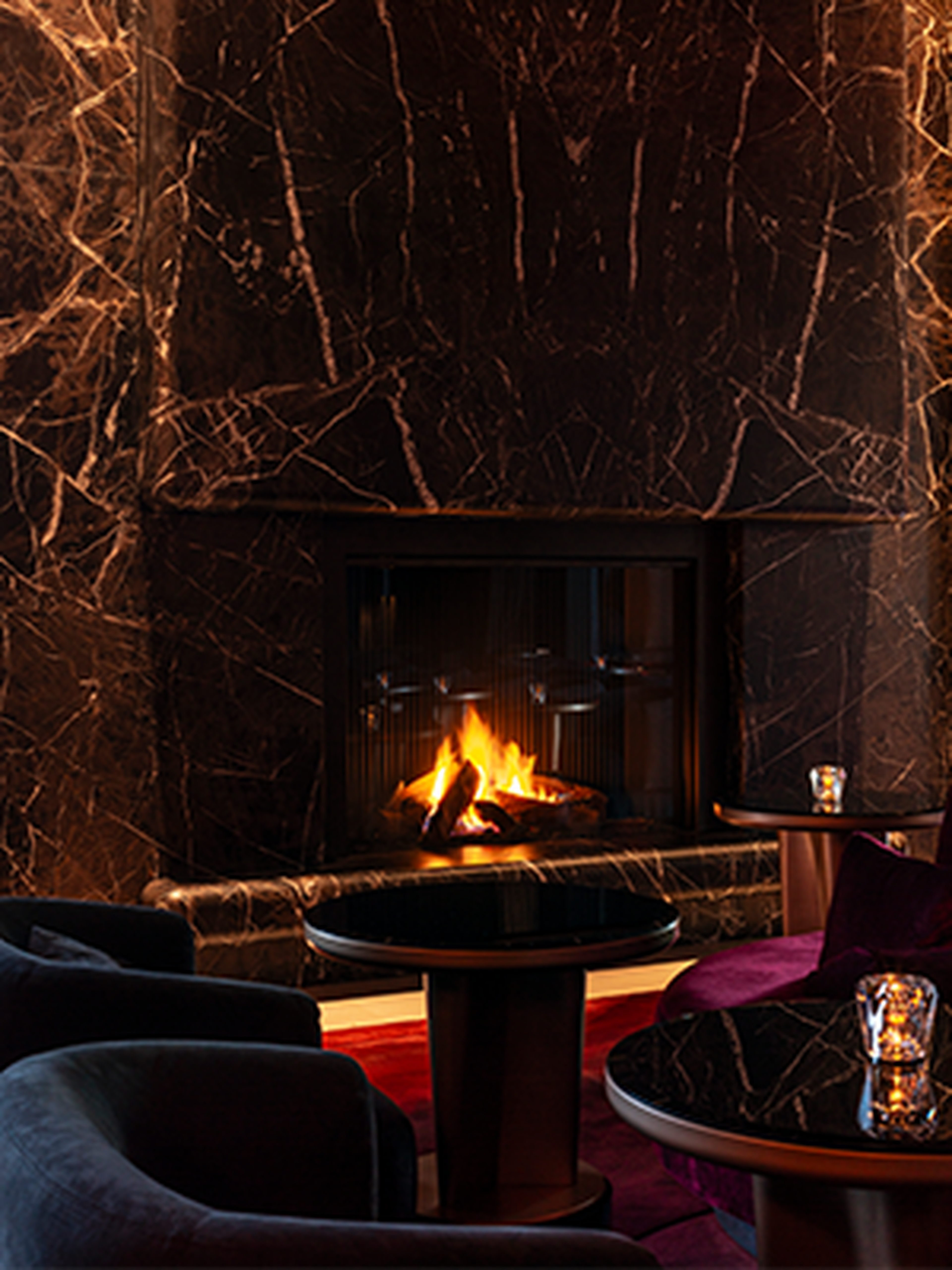 Massieve blokken Marron Napoleon werden zorgvuldig geselecteerd in Brachot Italy. Potier Stone heeft unieke ontwerpen gecreëerd in natuursteen: gebogen en doorlopende patronen vormen de open haard, een gebogen zitbank en "the Wall of Fame". Talloze beroemdheden hebben ooit Hotel La Réserve bezocht.