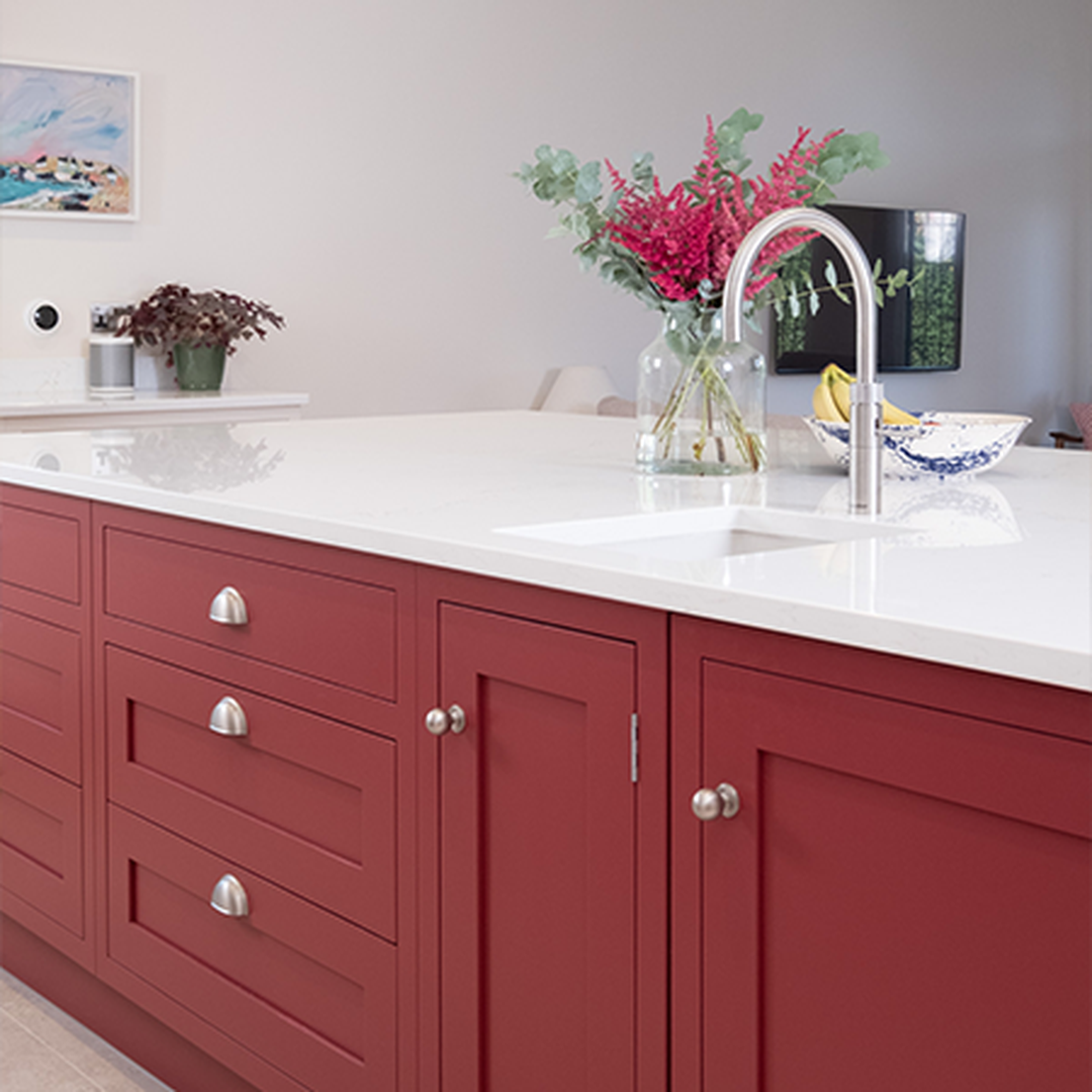 Rood keukeneiland, werkblad in Unistone Misterio Gold