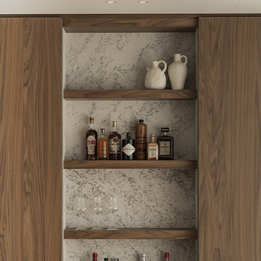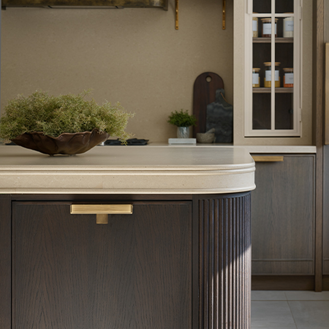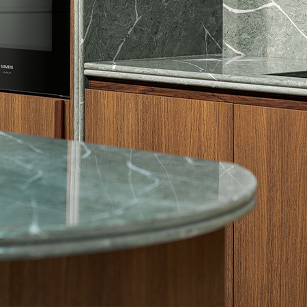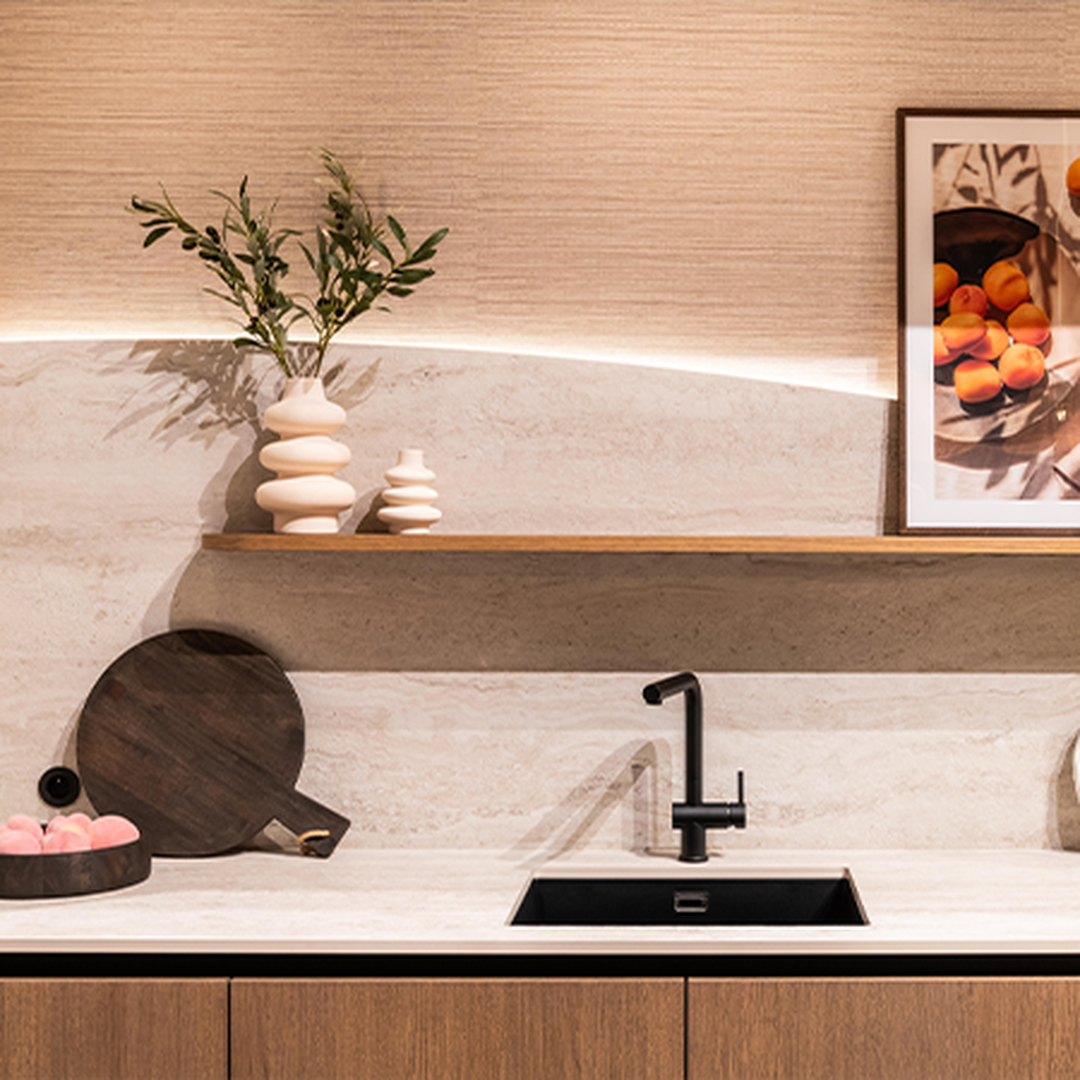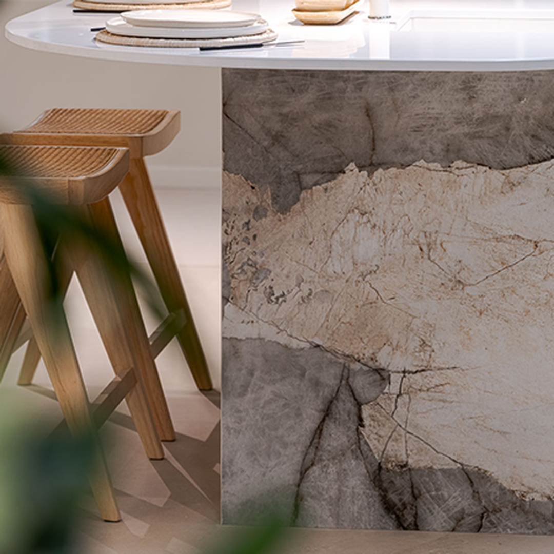 In keukens vertaalt zich dat naar afgeronde werkbladen, ovale eilanden en zachte overgangen tussen werkblad en spatwand. Natuursteen, maar ook keramische oppervlakken, lenen zich hier bijzonder goed voor: ze combineren uitstraling met duurzaamheid.