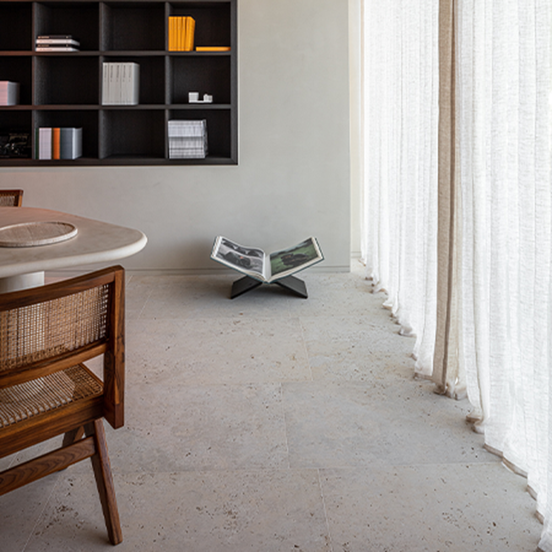 Travertin is daar een sterk voorbeeld van. Dankzij de kenmerkende poriënstructuur—gevormd door natuurlijke afzettingen en holtes doorheen de tijd—heeft de steen een levendig, tastbaar karakter. Natuursteenafwerkingen zoals sensato en arenado of strutturata bij keramische travertin-varianten versterken dat tactiele effect nog meer. Zachte beige- en crèmetinten voegen warmte toe, waardoor stenen zoals Pietra Bicci en Sinai Pearl bijzonder populair zijn.
