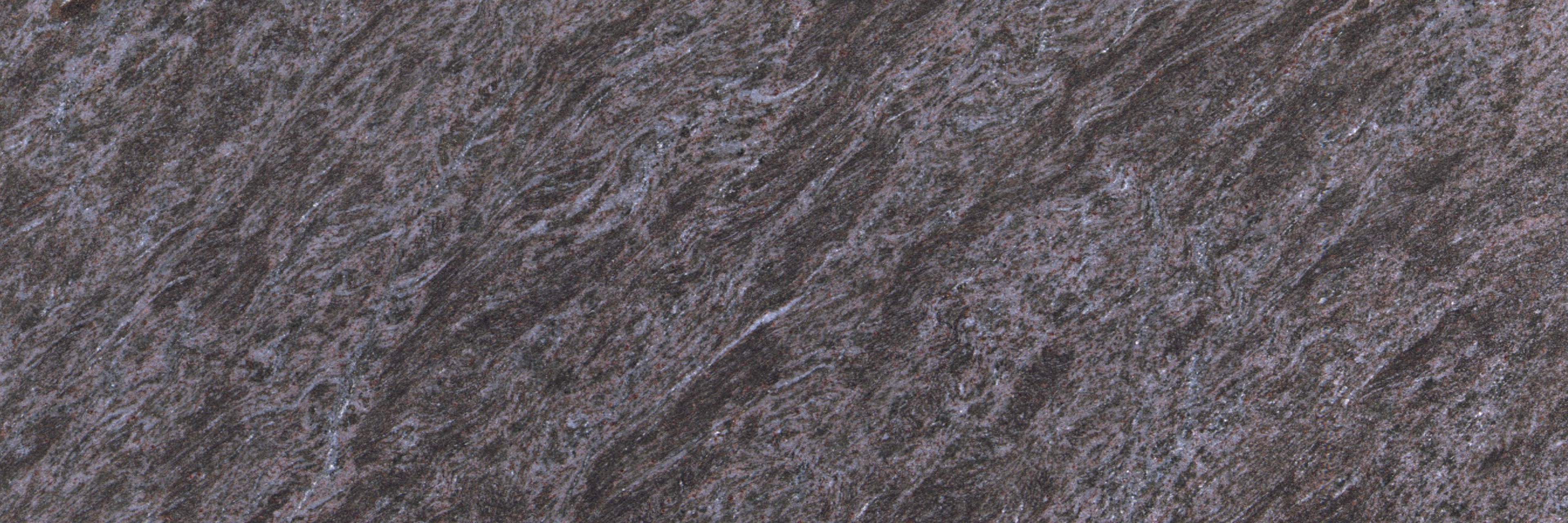 Beschrijving:Paarse-blauwachtige graniet met golvende donkere/lichtere banden en verspreide bordeaux-kleurige mineralen (granaat). De structuur vertoont plooifiguren en een gerichtheid. Fijnkorrelig tot matig fijnkorrelig gesteente.