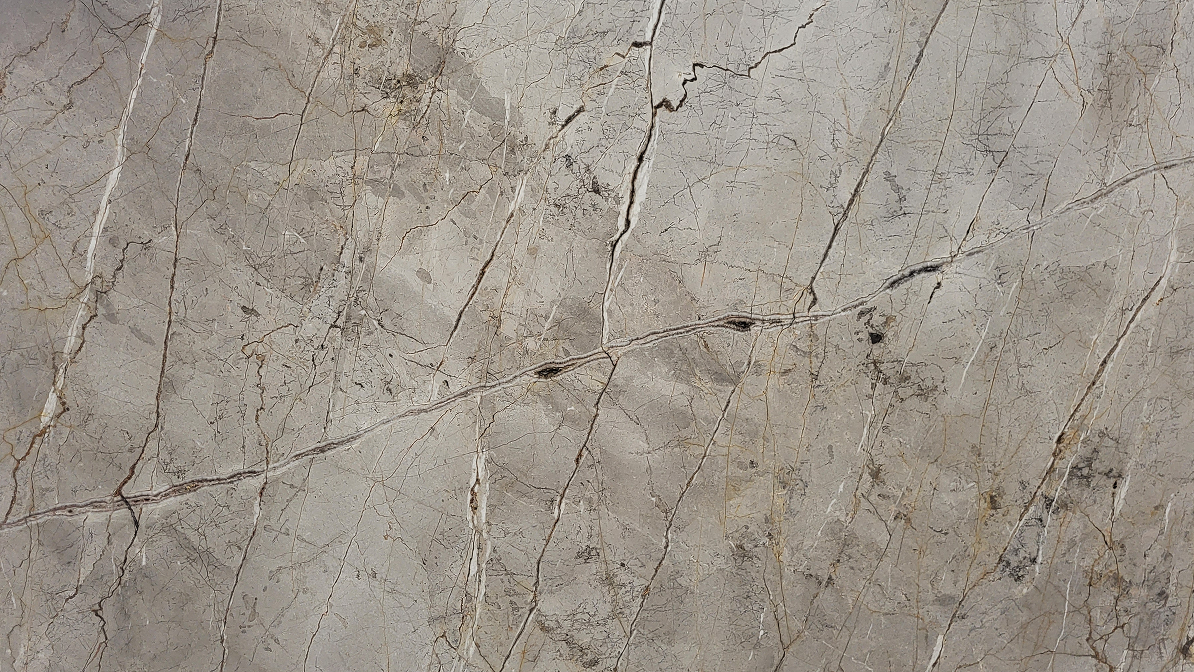 Beschrijving:Beige tot lichtgrijze compacte kalksteen met verspreide donkerder aders en bruine "ader"structuren.
