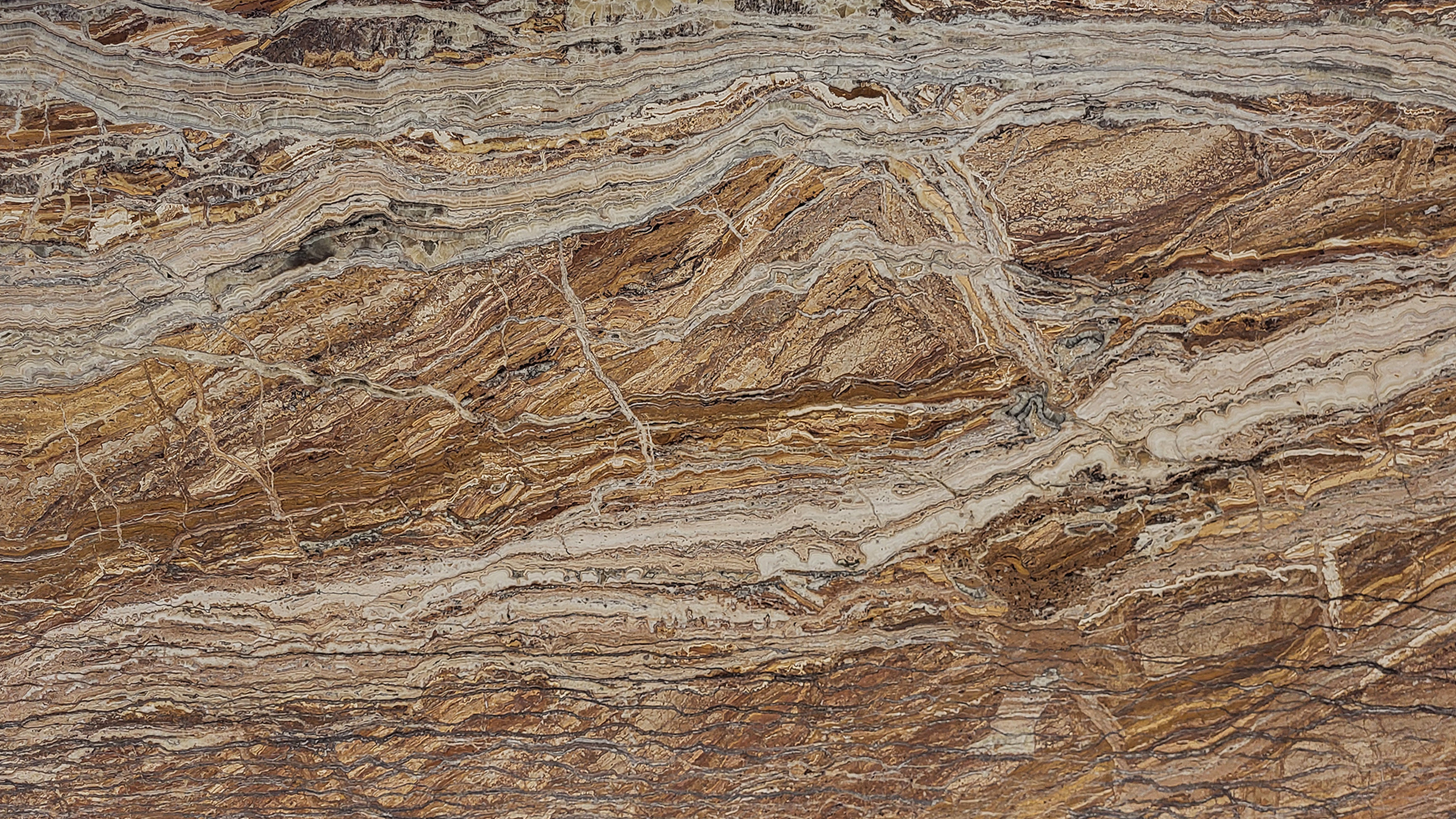 Beschrijving:Beige-oranje/bruine en witte marmer met travertijn-structuur (uitgesproken gelijnde tekening door donkerder lijnstructuur). De tekening is zeer heterogeen en vooral bandvormig (horizontaal en evenwijdig; gezaagd loodrecht op gelaagdheid).